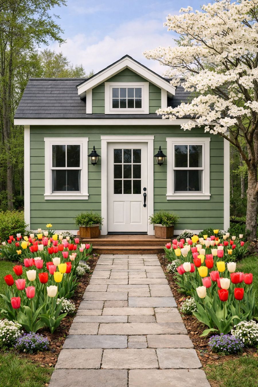 The exterior of this tiny home is a delightful blend of rustic charm and modern elegance. The sage green horizontal lap siding provides a soothing backdrop that complements the natural surroundings. Crisp white trim outlines the windows and doors, adding a touch of classic sophistication to the overall look. A wide entry path welcomes visitors, bordered by vibrant spring tulips that infuse the scene with bursts of color and joy. The presence of a blooming dogwood tree adds a graceful touch, its delicate flowers contrasting beautifully against the home's earthy hues.