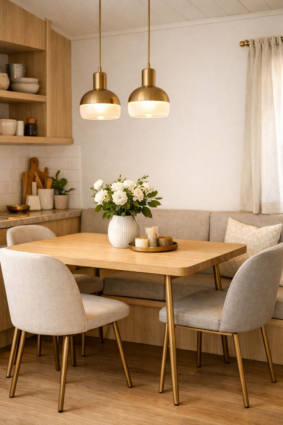 The dining area is a masterclass in maximizing space without compromising on style. A compact yet elegant dining table sits at the heart of the area, surrounded by chic chairs that echo the home's overall aesthetic. The use of light wood and subtle metallic accents creates an inviting atmosphere perfect for cozy meals. Pendant lighting overhead casts a soft glow, enhancing the intimate feel of the space. Thoughtful touches, like a small indoor plant or a vase of fresh flowers, bring a touch of nature indoors, reinforcing the home's connection to its surroundings.