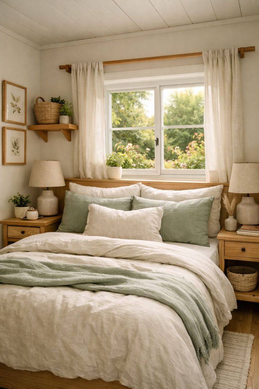 The bedroom is a serene retreat, designed to promote rest and relaxation. Soft, neutral tones dominate the color scheme, with accents of sage green adding a cohesive touch to the space. A comfortable bed with plush linens takes center stage, flanked by simple yet stylish nightstands. Natural materials, such as wood and cotton, are used throughout the decor, creating a warm and inviting atmosphere. A well-placed window offers a view of the garden, allowing for a gentle morning wake-up call from the sun's rays.