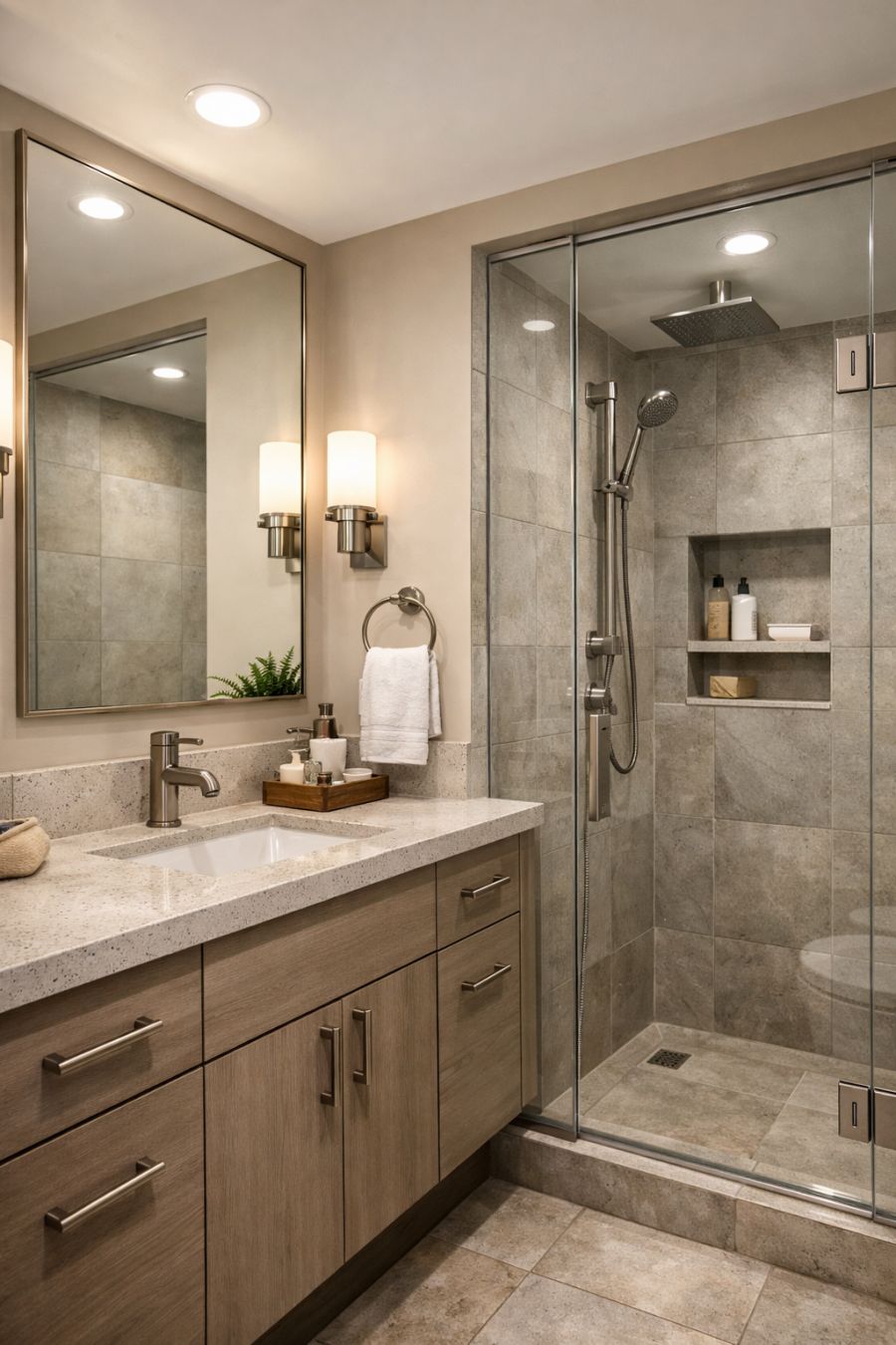 The bathroom combines practicality with elegance, featuring a clean and uncluttered design. The use of neutral tiles and a large mirror enhances the sense of space, while a well-appointed vanity provides ample storage for personal items. Stylish fixtures in brushed metal add a touch of modernity, contrasting beautifully with the natural stone surfaces. The shower area is thoughtfully designed with glass doors to maintain an open feel, and strategically placed lighting ensures the space remains bright and welcoming. Overall, the bathroom is a functional yet stylish sanctuary within the home.
