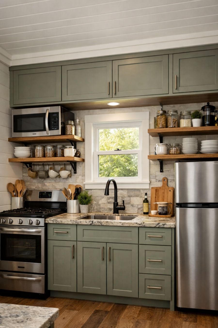 The kitchen is a testament to efficient design, where every inch is utilized to its fullest potential. Sleek cabinetry in a muted sage tone pairs seamlessly with modern stainless steel appliances, offering both functionality and style. Open shelving provides easy access to everyday essentials while adding a sense of openness and depth to the space. The countertops, crafted from natural stone, offer a durable and visually appealing surface for meal preparation. A small window above the sink lets in ample light, making the kitchen a bright and cheerful space to cook and create.