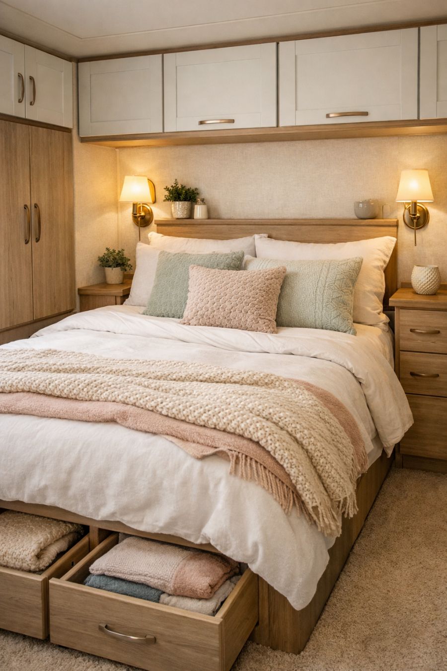 In the bedroom, tranquility reigns supreme. The centerpiece is a plush queen-sized bed adorned with crisp, white linens and a variety of textured throw blankets and cushions, creating a haven of comfort. Soft, ambient lighting is provided by wall sconces on either side of the bed, perfect for evening reading. A compact wardrobe and under-bed storage make efficient use of the space, ensuring that everything has its place. The room's calming color palette of soft whites and muted pastels enhances the serene atmosphere, making it an ideal retreat.