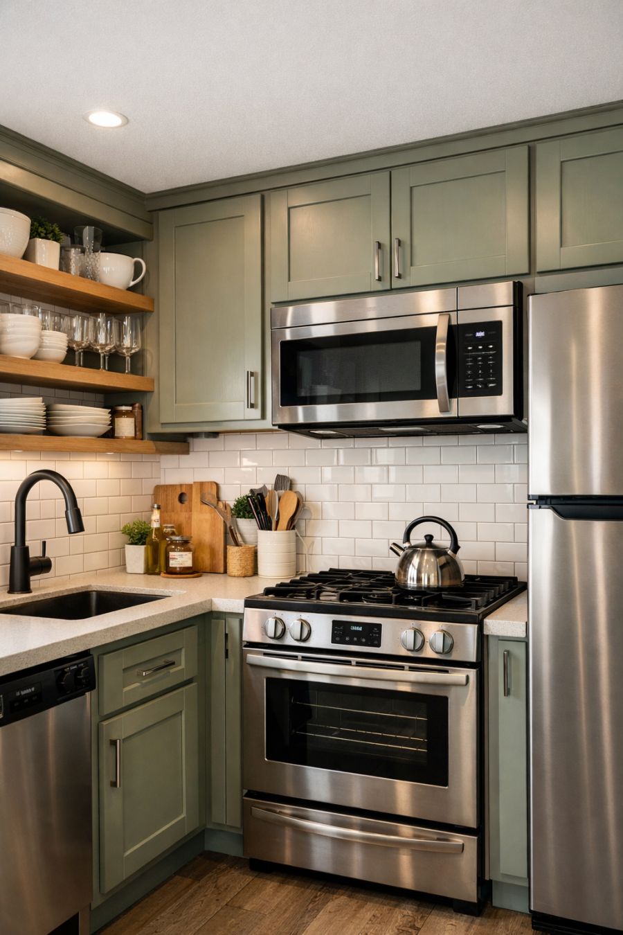 The kitchen, though compact, is a model of efficiency and style. Sleek cabinetry in a muted sage green pairs beautifully with a gleaming subway tile backsplash, offering a nod to classic design. Modern appliances are seamlessly integrated, providing all the functionality needed for gourmet cooking. Open shelving displays an array of stylish dishware and glassware, adding a personal touch to the space. The kitchen's thoughtful layout ensures ease of movement, while its aesthetic appeal makes it a pleasure to spend time in.