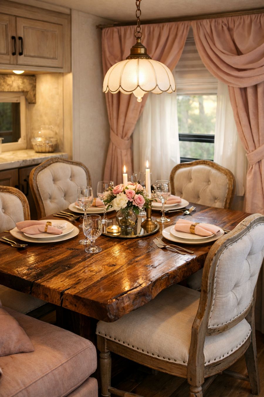 The dining area continues the theme of unexpected luxury with a small yet elegant table set for four. The table itself is a work of art, crafted from reclaimed wood with a polished finish that highlights its natural grain. Surrounding it are vintage-inspired chairs upholstered in a soft, neutral fabric that complements the pink hues of the lounge. Overhead, a delicate pendant light casts a warm glow, creating an intimate setting perfect for cozy meals. The blend of rustic and refined elements gives the space a unique character that feels both timeless and contemporary.