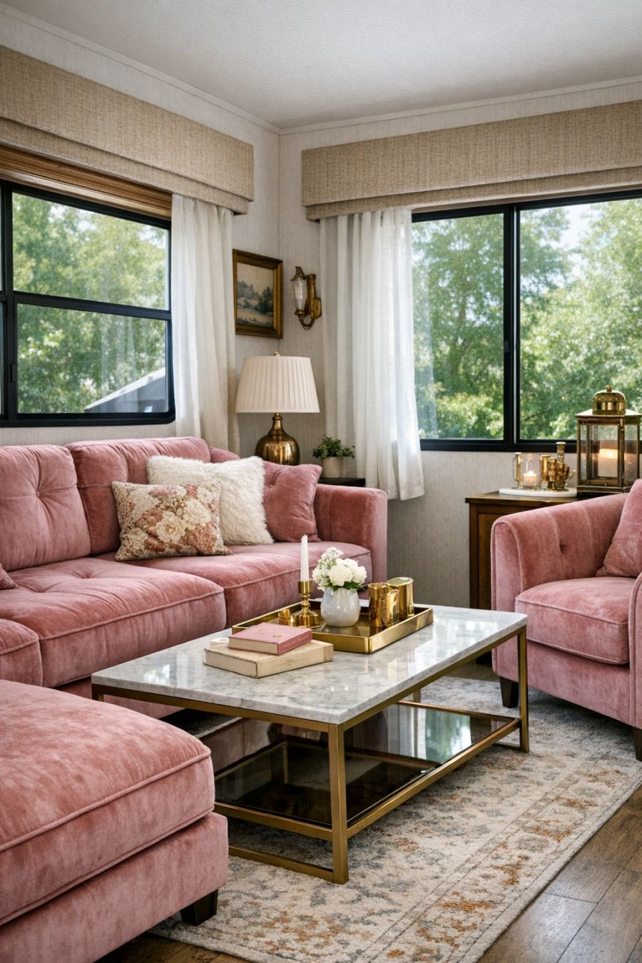Upon entering, the living area immediately captivates with its plush pink velvet lounge interior. The soft, luxurious seating invites you to sink in and relax, offering a striking contrast to the rustic exterior. Large windows frame the room, allowing natural light to flood the space and illuminate the rich textures and colors. The decor blends modern chic with vintage charm, featuring elegant throw pillows, a sleek coffee table, and subtle brass accents that add a touch of sophistication.
