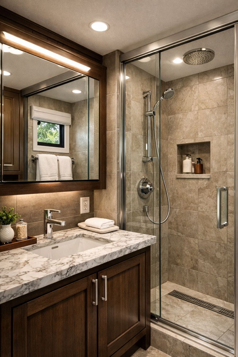 The bathroom is a study in minimalist luxury, featuring high-quality materials and meticulous design. A sleek, glass-enclosed shower offers a modern touch, complemented by elegant chrome fixtures that add a sense of refinement. The vanity is topped with a marble countertop, providing a touch of opulence against the backdrop of muted, earthy tiles. Natural light filters in through a small window, highlighting the thoughtful details and creating an airy, refreshing ambiance. Every element in the bathroom is designed for both functionality and style, ensuring a pleasant experience.