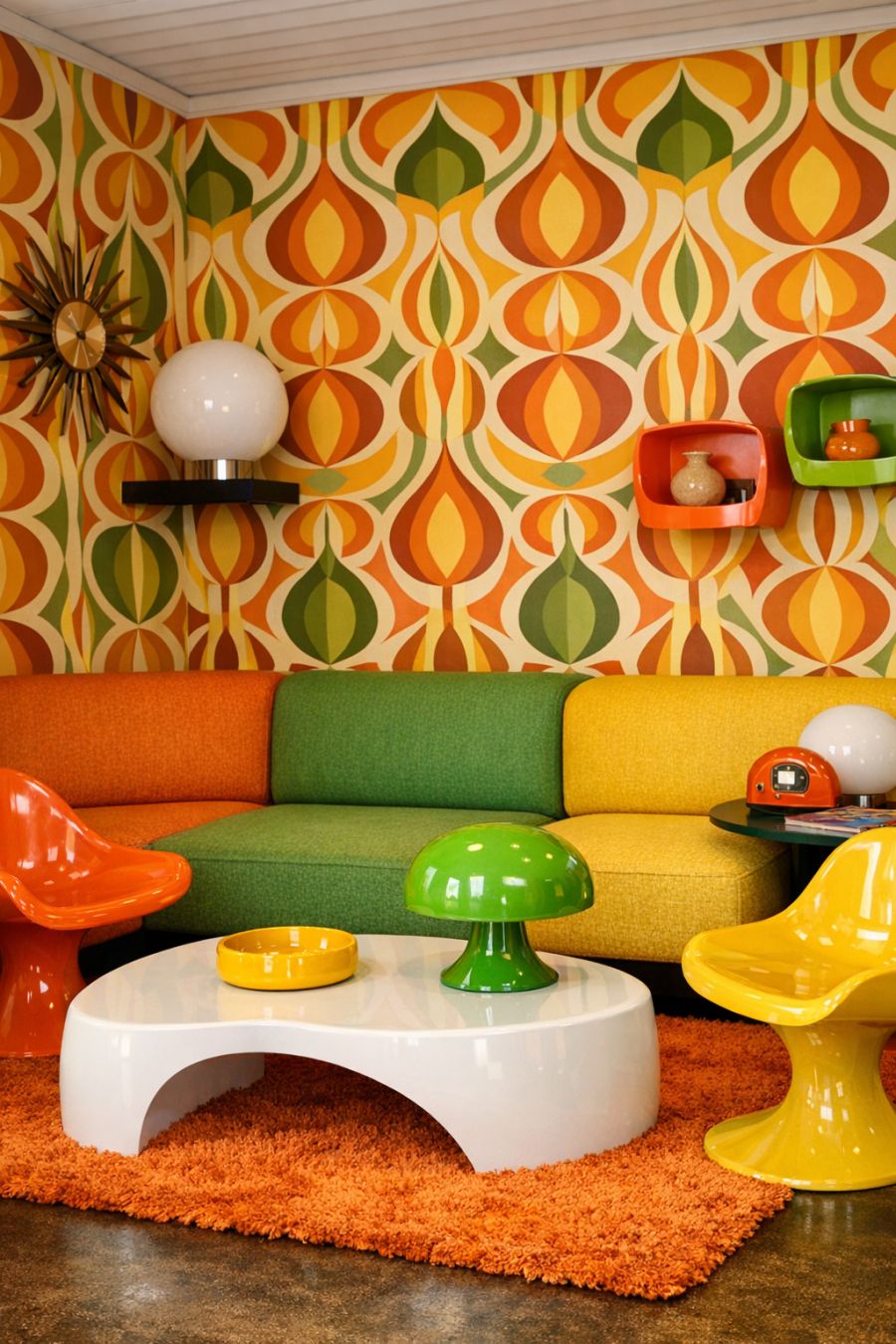 Stepping into the living area, one is immediately transported back to the 1960s, with vibrant geometric wallpaper adorning the walls. The psychedelic patterns create a lively backdrop that is both energizing and nostalgic. Molded plastic furniture, in bold hues of orange, yellow, and green, serves as a functional nod to the era's iconic design trends. The space is anchored by a low-slung modular sofa, inviting relaxation while maintaining the room's retro flair.