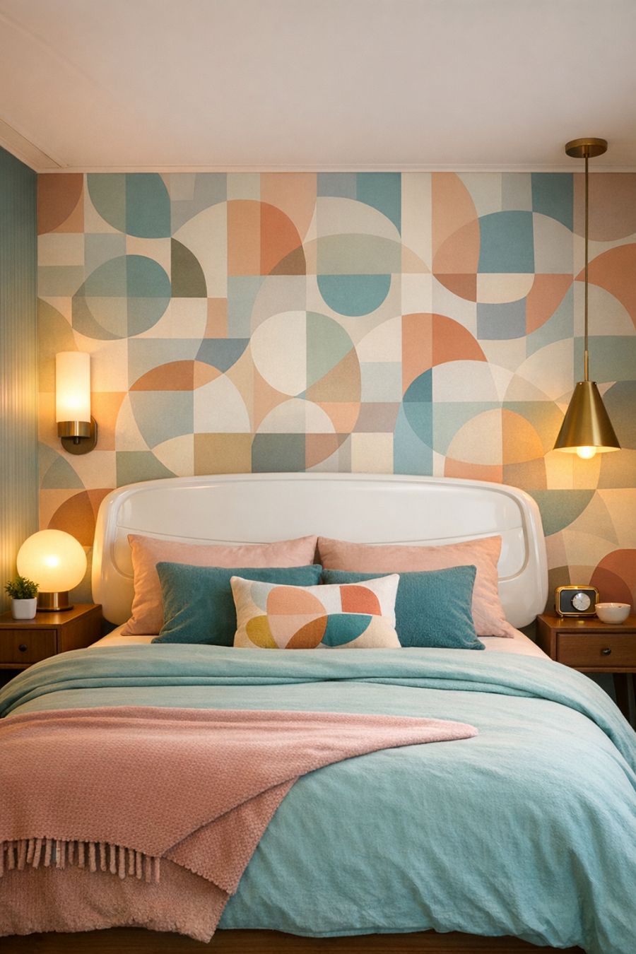 The bedroom offers a serene escape with a continuation of the home's bold design elements. A feature wall of geometric wallpaper in soothing pastels sets a calming tone, while the bed, with its sleek molded plastic headboard, provides a modern yet retro focal point. Plush textiles in coordinating hues add a layer of comfort, while strategically placed lighting ensures a cozy ambiance. The room is a harmonious blend of color and tranquility, offering a perfect retreat.