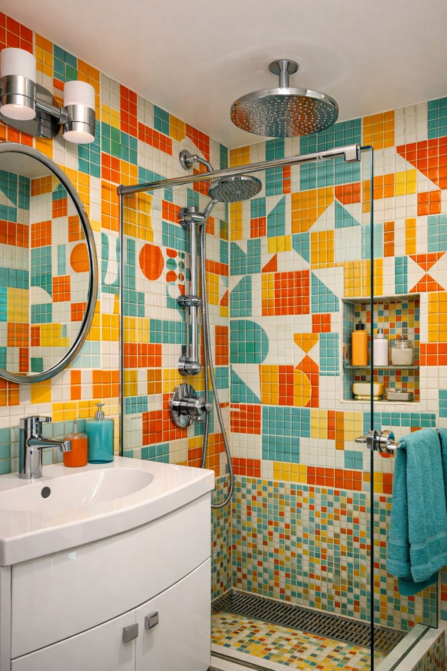 The bathroom is a testament to the home's commitment to style and functionality. Clad in bright, mosaic tiles that echo the geometric patterns of the rest of the house, the space feels like a work of art. The fixtures, in gleaming chrome, add a modern touch that enhances the retro aesthetic. A spacious walk-in shower boasts a rain showerhead, providing a luxurious experience. The overall atmosphere is both invigorating and refreshing, creating a space that is as functional as it is stylish.