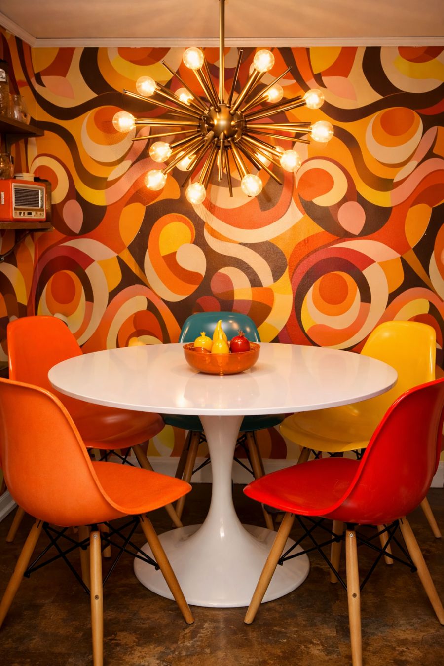 The dining area continues the retro theme, featuring a round tulip table surrounded by colorful Eames-style chairs. The table's sleek white surface contrasts beautifully with the vibrant wallpaper, which features swirling patterns reminiscent of a psychedelic dreamscape. Above, a starburst chandelier casts a warm glow, highlighting the playful yet sophisticated nature of the space. This area is perfect for both casual meals and lively dinner parties, offering a dynamic mix of style and functionality.