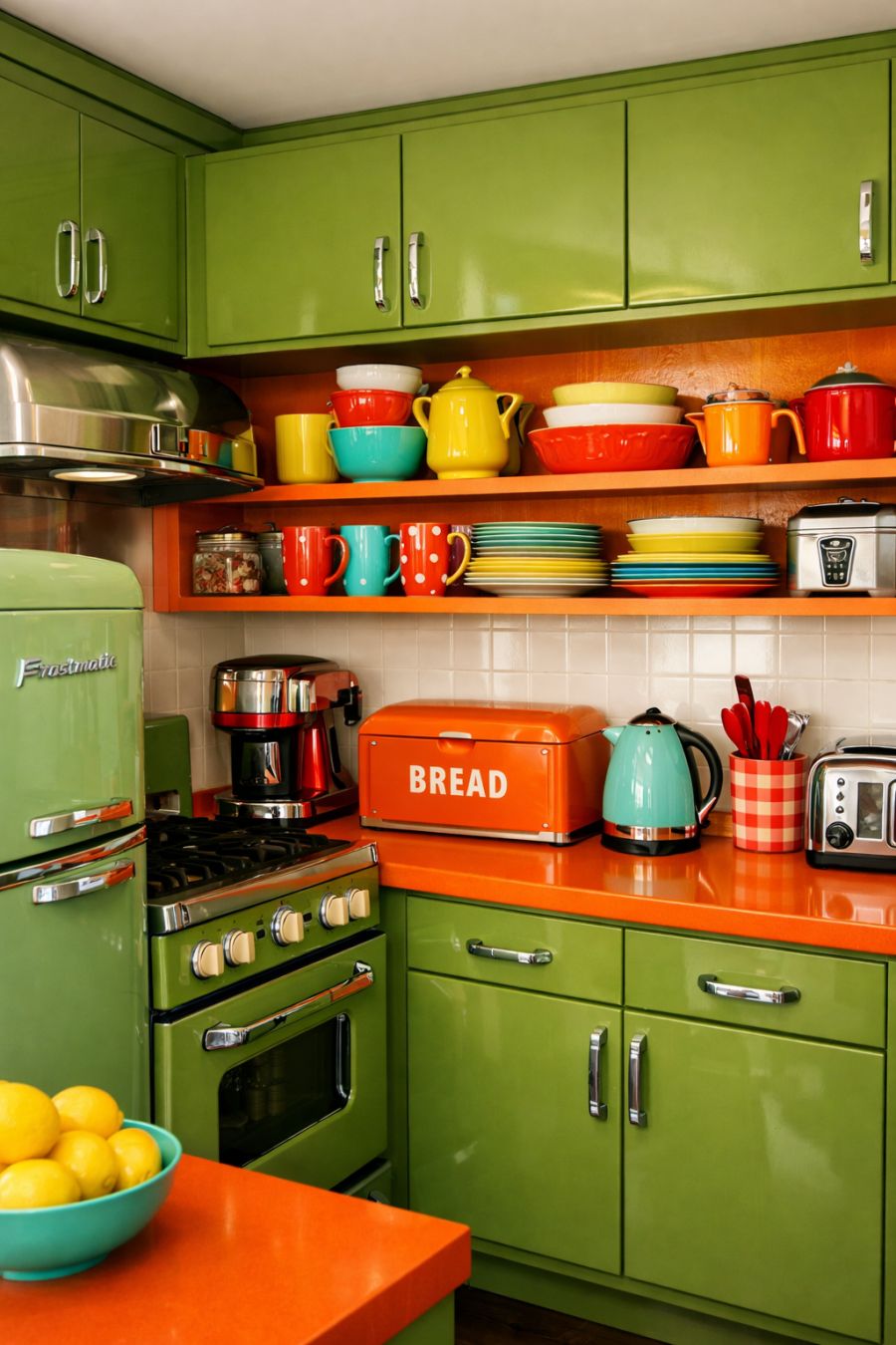 In the kitchen, the retro theme is realized through a palette of bright colors and streamlined forms. Glossy, avocado green cabinetry paired with bold orange countertops creates a bold statement. Vintage-inspired appliances, complete with chrome finishes, offer modern functionality with a nostalgic twist. The open shelving displays an array of colorful dishware, adding to the kitchen's vibrant and inviting atmosphere, making it a joyous space for culinary adventures.