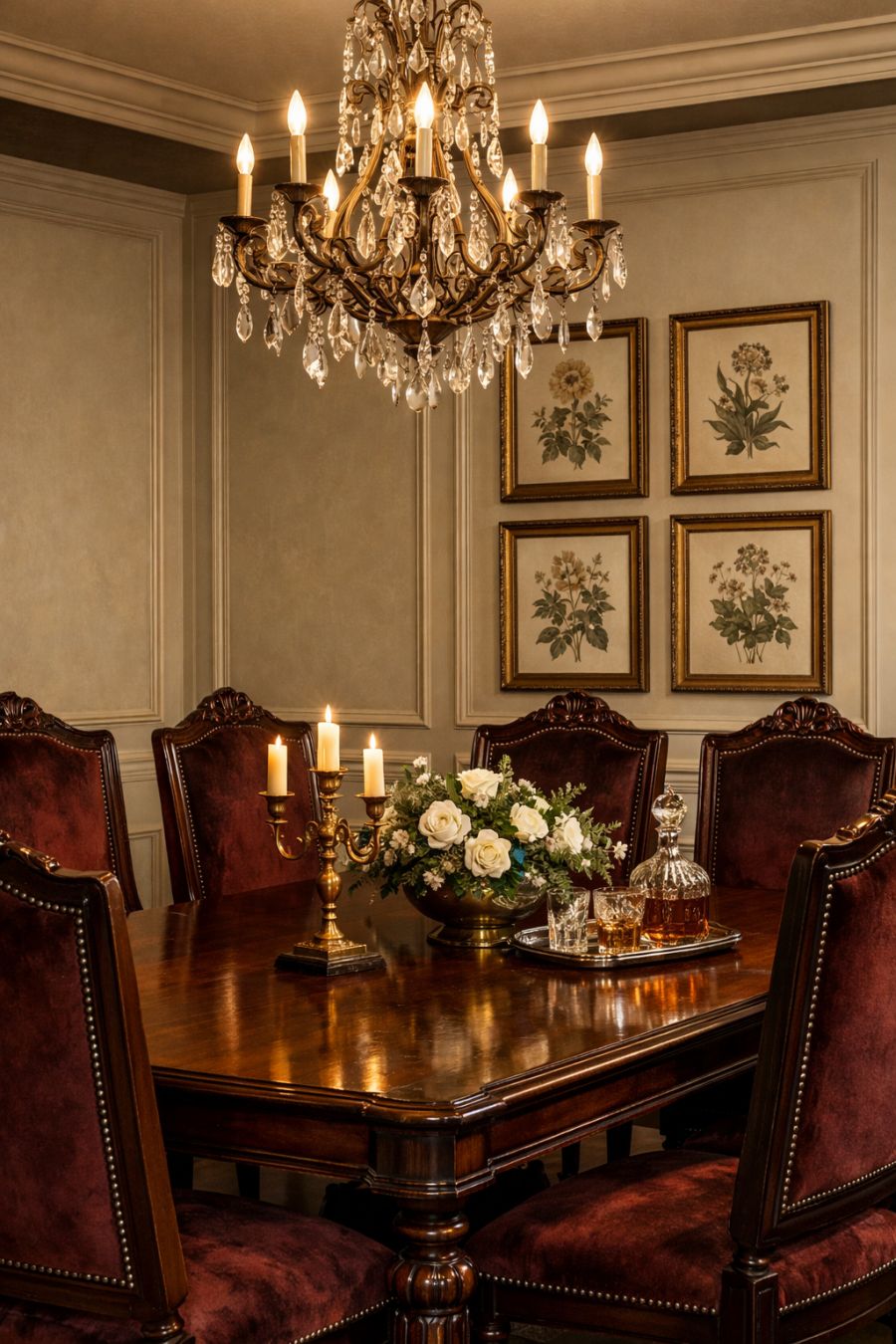 The dining area is a space where opulence and intimacy coexist. A grand, mahogany dining table serves as the room's centerpiece, surrounded by high-backed chairs upholstered in deep burgundy velvet. An elaborate chandelier hangs overhead, casting a soft, ambient glow that enhances the room's luxurious feel. The walls are adorned with classic wainscoting and a series of framed vintage botanical prints, adding to the timeless elegance of the space.
