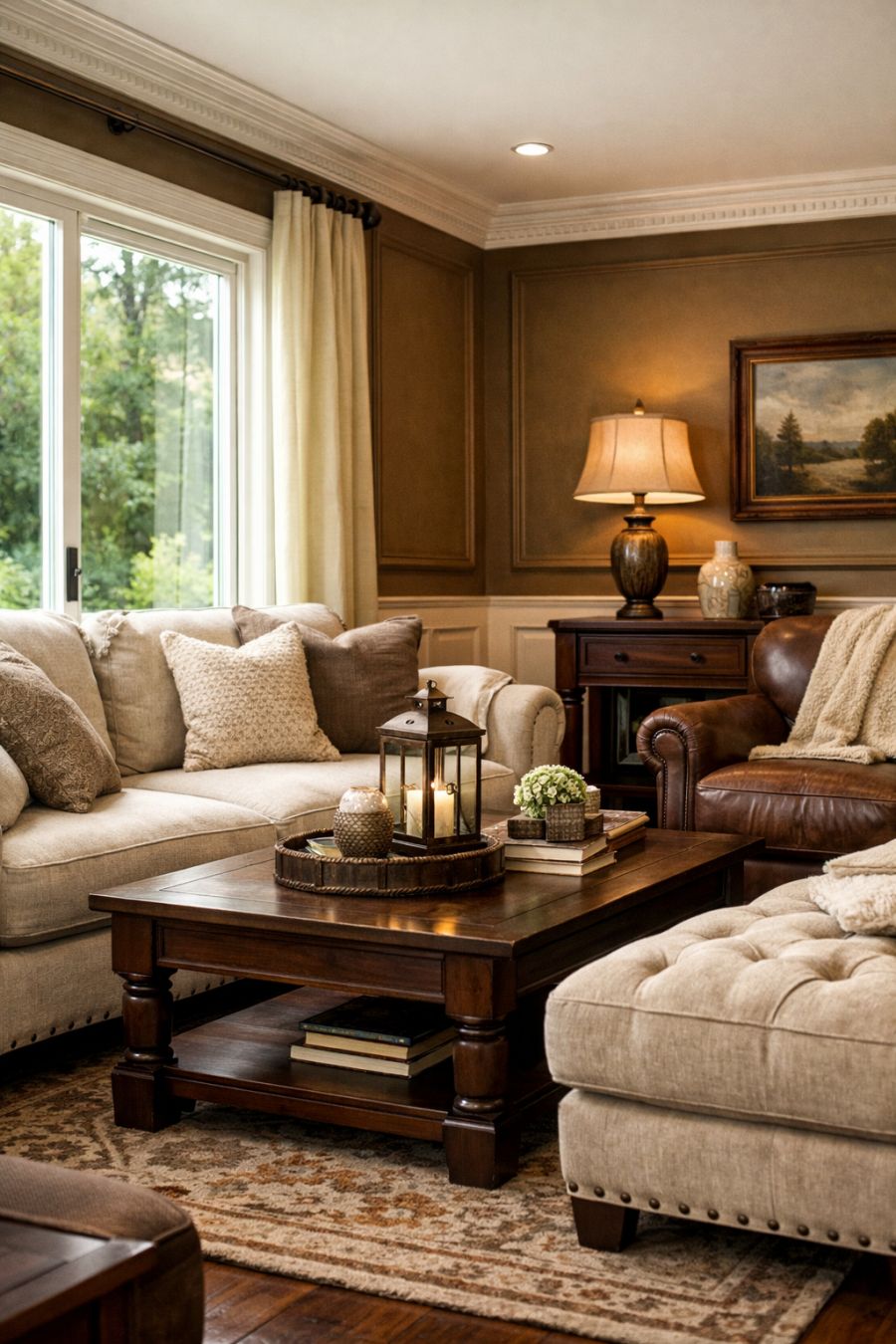 Stepping inside, the living area reveals a sophisticated blend of modern comfort and classic style. The space is adorned with plush, overstuffed furniture upholstered in rich, neutral fabrics that invite relaxation. Large windows allow natural light to flood the room, highlighting the intricate woodwork and crown moldings that add a touch of elegance. The walls are painted in warm tones, creating a cozy atmosphere that perfectly complements the refined furnishings.