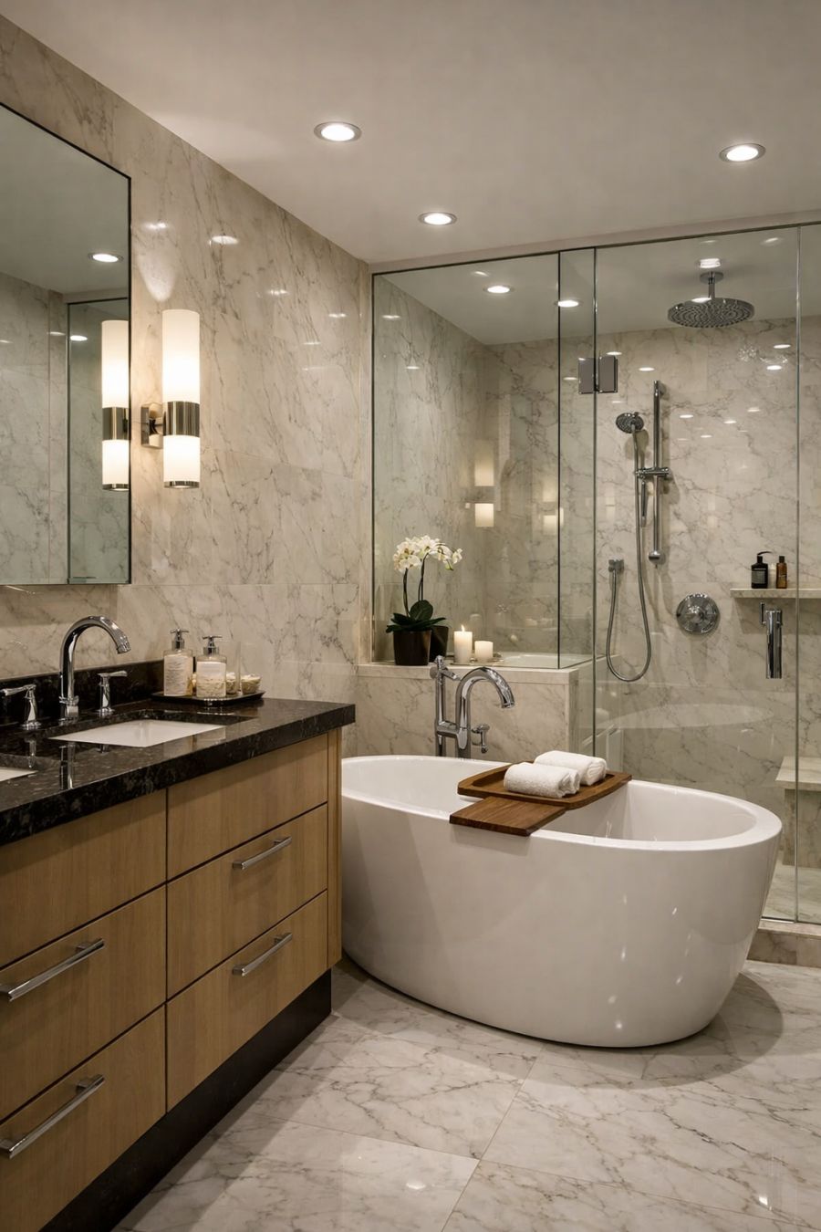 The bathroom is a study in elegance and functionality, featuring high-end materials and thoughtful design. Walls clad in pale marble create a sense of serene luxury, while a large, freestanding soaking tub offers a perfect spot for relaxation. The double vanity, topped with polished stone, provides ample space for daily rituals, and the polished chrome fixtures add a touch of modern sophistication. A spacious, glass-enclosed shower and strategically placed lighting ensure the bathroom is as practical as it is beautiful.