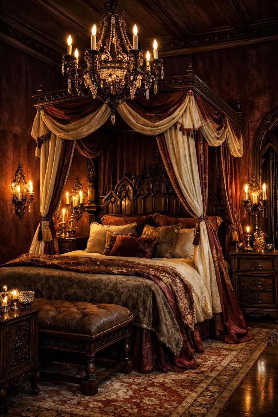 The bedroom is a sanctuary of tranquility and sophistication, continuing the home's rich Venetian gothic theme. The walls are adorned with deep, velvety fabric panels that create a cocoon of comfort and warmth. A grand canopy bed, draped with luxurious textiles, serves as the room's centerpiece, inviting restful slumber. Soft, ambient lighting is provided by ornate sconces and a central chandelier, casting gentle shadows that enhance the room's serene atmosphere. Plush rugs underfoot add an additional layer of comfort, making the bedroom a perfect retreat from the outside world.