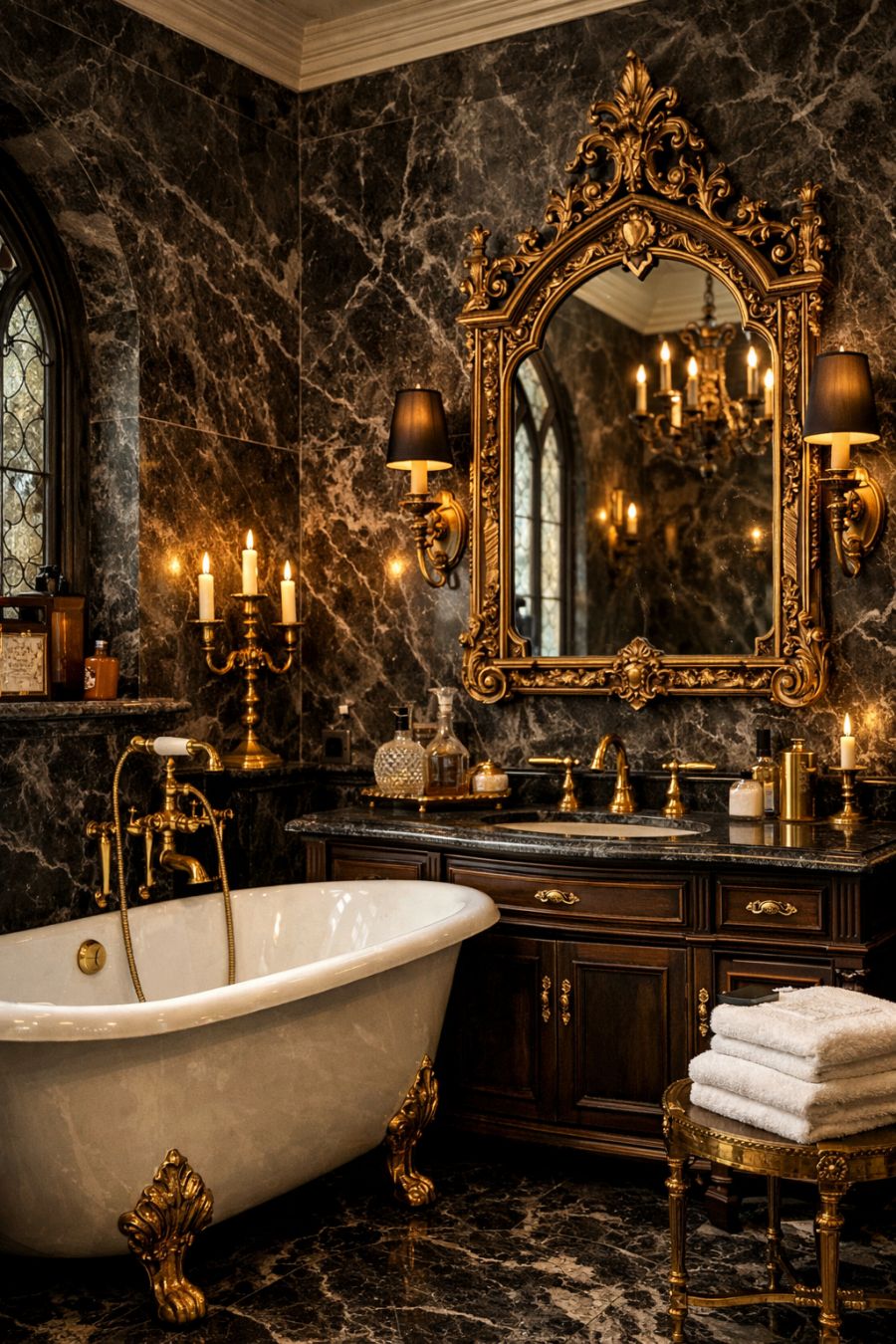 The bathroom is a study in gothic elegance, with a focus on luxurious materials and thoughtful design. The walls are clad in dark, richly veined marble, creating a dramatic and sophisticated backdrop. A freestanding clawfoot tub commands attention, offering a luxurious spot for relaxation. Brass fixtures and fittings add warmth and contrast to the cool tones of the marble, while an ornate mirror above the vanity reflects the room's opulence. The layout is both functional and stylish, ensuring that every visit is a moment of indulgence.