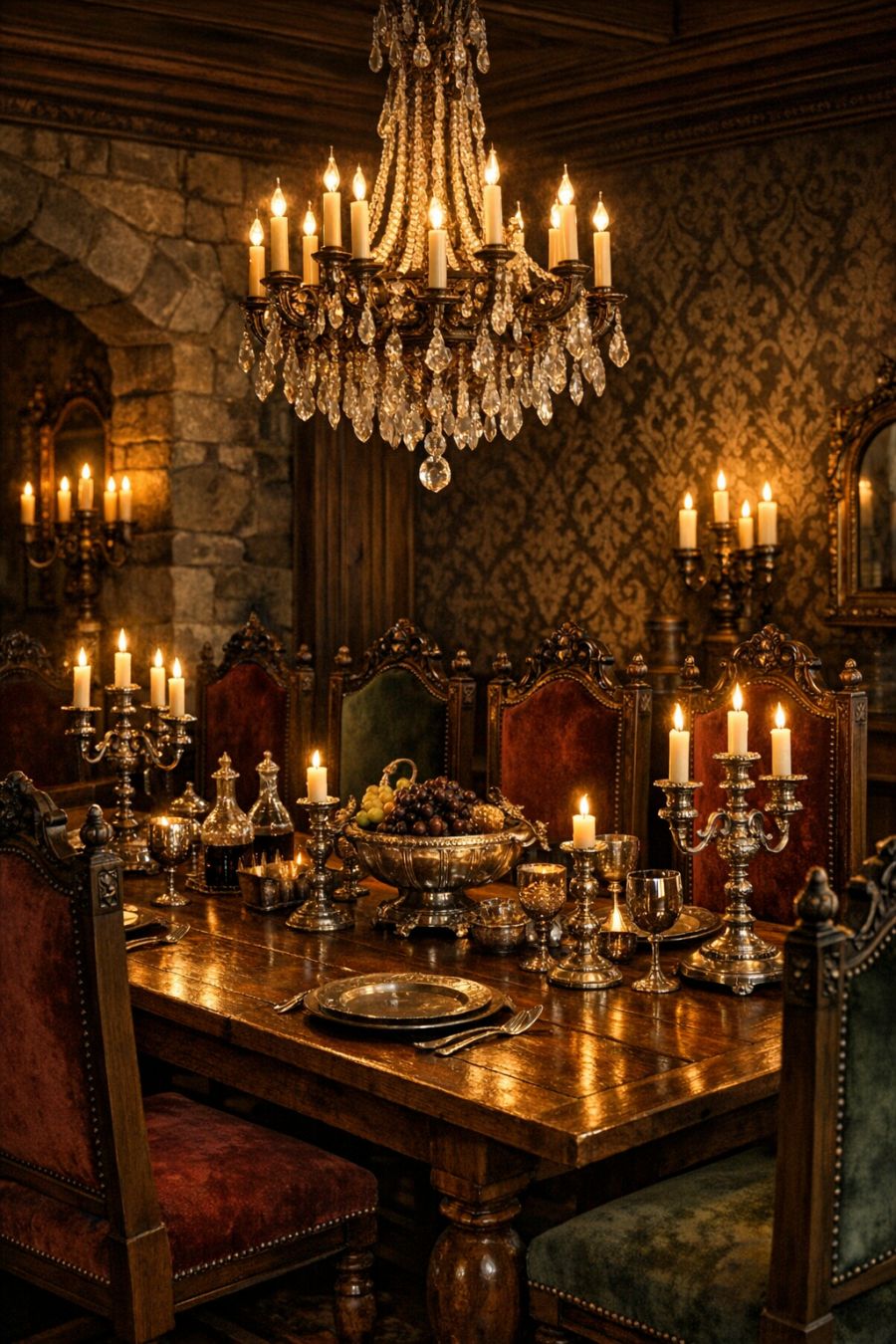 The dining area continues the theme of gothic grandeur with a long, wooden table surrounded by high-backed chairs upholstered in deep, rich fabrics. A grand chandelier hangs overhead, casting a warm glow that highlights the damask-patterned walls. Ornate candelabras and antique silverware adorn the table, adding layers of old-world charm. The space is designed for intimate gatherings, where the ambiance encourages conversations and lingering over meals. This dining room is not just a place to eat, but a venue for creating lasting memories in a setting that feels both regal and inviting.