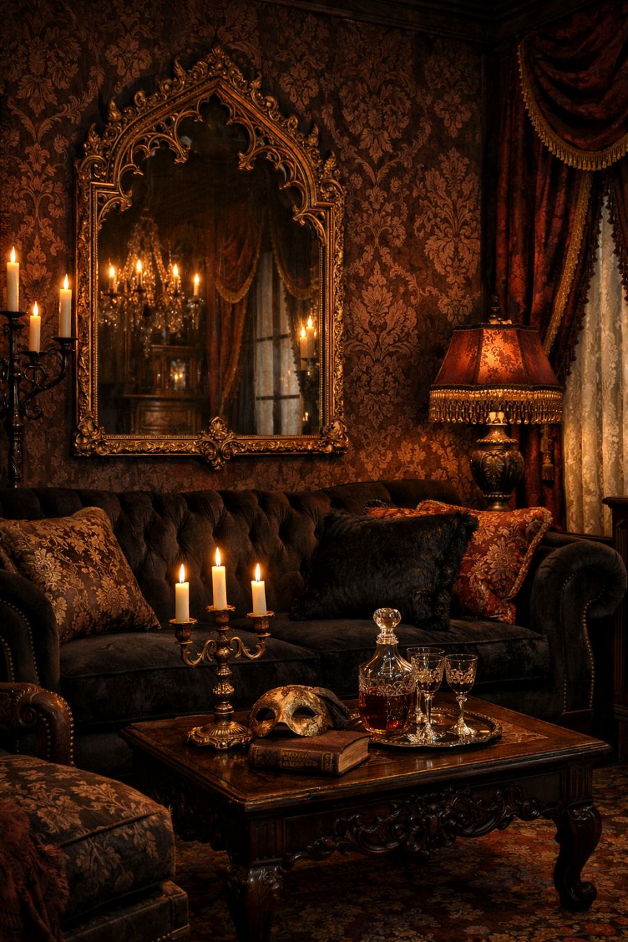 Upon entering the cottage, the living area envelops visitors in a rich Venetian gothic atmosphere. The damask walls, adorned with intricate patterns, set a dramatic tone that is both elegant and inviting. Ornate mirrors reflect the subdued lighting, creating an illusion of space and depth while adding a touch of opulence. Deep, plush seating in dark, luxurious fabrics invites relaxation, and the heavy draperies frame the windows, enhancing the room's moody aesthetic. The overall effect is that of a sophisticated retreat, where every detail contributes to a sense of timeless elegance.