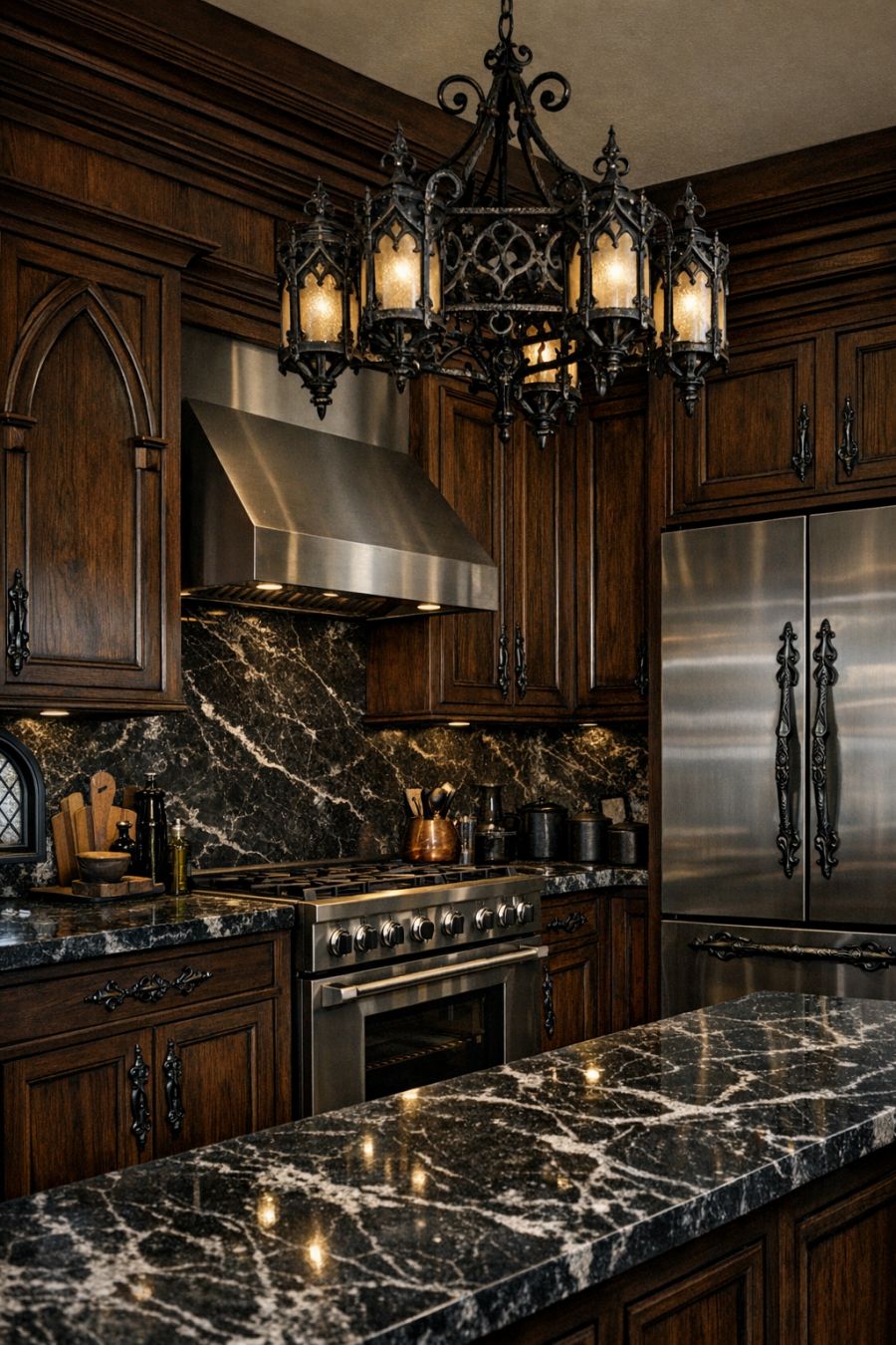 In the kitchen, the gothic influence is tempered with modern functionality. Dark wood cabinetry provides ample storage while maintaining the room's moody aesthetic. The countertops, made of polished marble with deep veining, add a luxurious touch and are paired with state-of-the-art stainless steel appliances that ensure a seamless cooking experience. Ornate ironwork details can be found on the cabinet handles and light fixtures, tying the kitchen's design to the rest of the home's gothic theme. It's a space where culinary creativity can flourish, surrounded by beauty and elegance.