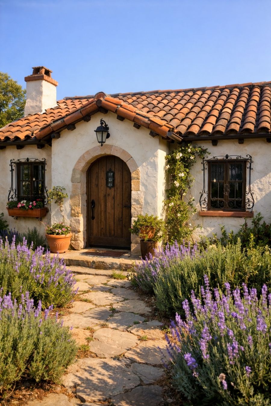 The exterior of this Mediterranean cottage is a picturesque vision of warmth and charm. Its creamy stucco walls bask in the sunlight, providing a perfect backdrop for the weathered terracotta barrel roof tiles that crown the structure. Wrought iron window grilles add an element of traditional craftsmanship, enhancing the cottage’s timeless appeal. An arched wooden entry door invites guests to step inside, while a path lined with lavender bushes and rosemary guides them toward this enchanting abode. Captured from a 3/4 angle in amateur photography, the facade exudes a welcoming allure that hints at the surprises within.