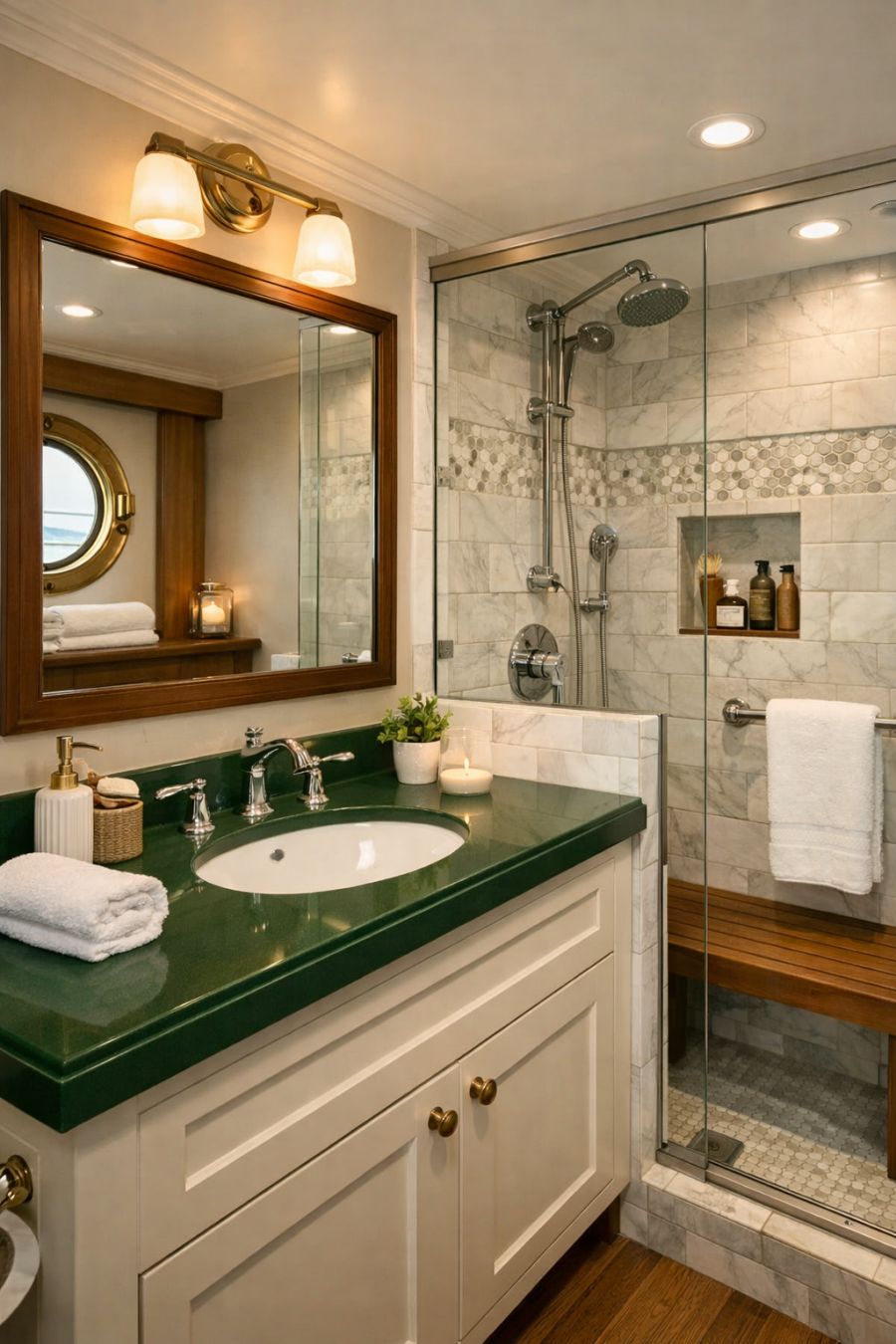 The bathroom is a blend of functionality and style, featuring modern fixtures that complement its classic design. A sleek vanity with a forest green countertop provides a pop of color against the neutral walls, while a large mirror enhances the sense of space. The shower area is elegantly tiled, offering both practicality and a touch of luxury. Subtle lighting and thoughtful details create a soothing ambiance, making it a space where one can unwind and refresh in comfort.