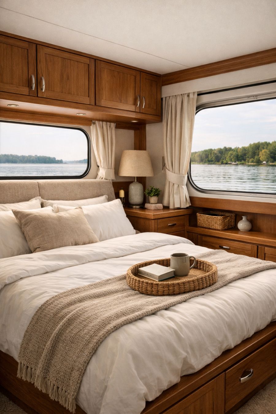The bedroom is a tranquil haven, designed to offer peace and relaxation after a day spent on the water. Soft, neutral tones dominate the color scheme, creating a soothing atmosphere that promotes restful sleep. A plush bed with crisp linens is positioned to take full advantage of the scenic views, while elegant wooden accents add a touch of rustic charm. Minimalist yet inviting, the space is thoughtfully appointed with storage solutions that maintain the room's clean and uncluttered look.