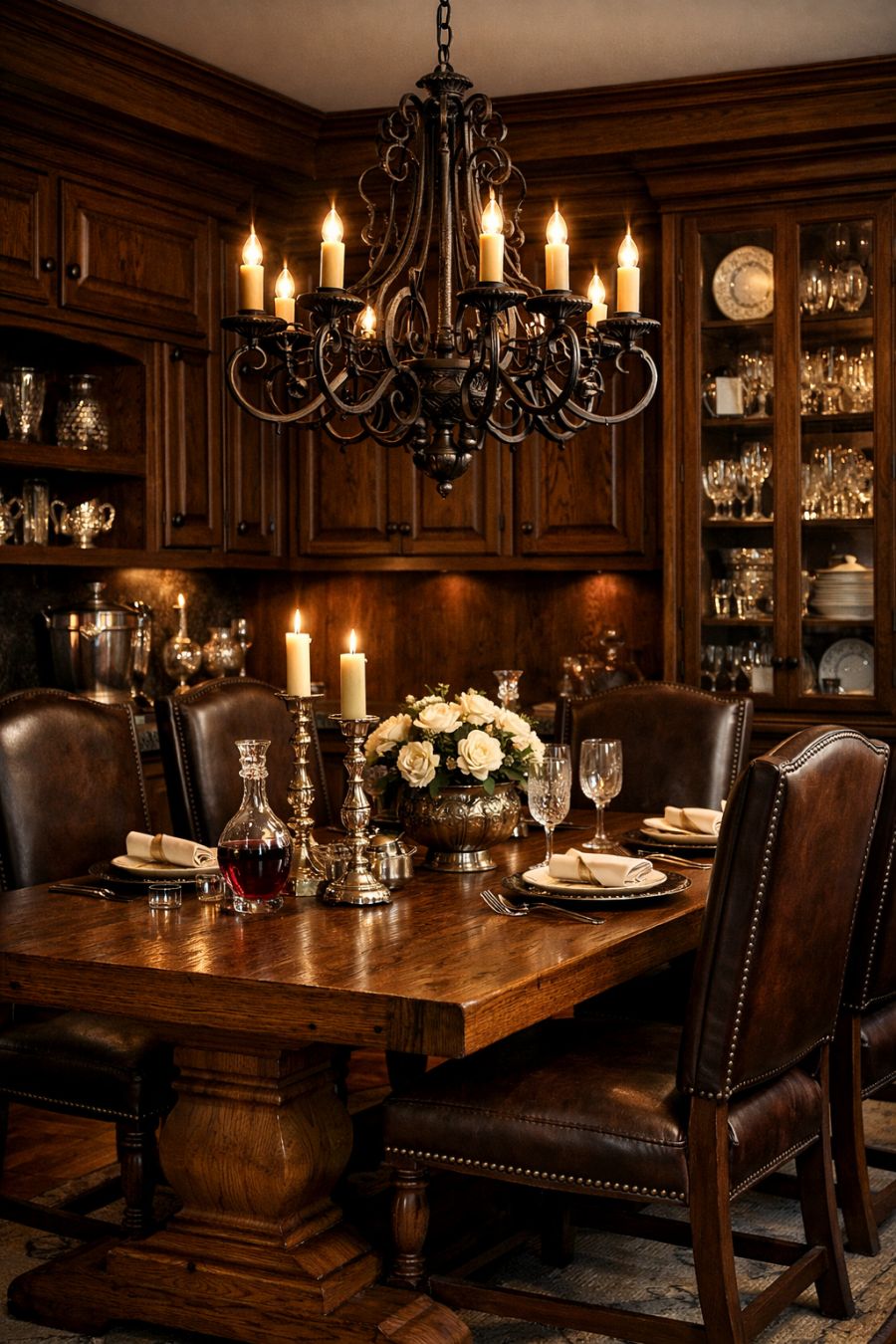 The dining area continues the theme of traditional elegance, with a heavy oak dining table taking center stage. Surrounded by high-backed leather chairs, the table is set beneath a grand, wrought-iron chandelier. Dark wood cabinets line the walls, filled with fine china and crystal glassware, ready for any occasion. The deep tones of the wood contrast beautifully with the soft, ambient lighting, creating an inviting atmosphere for dinner gatherings.