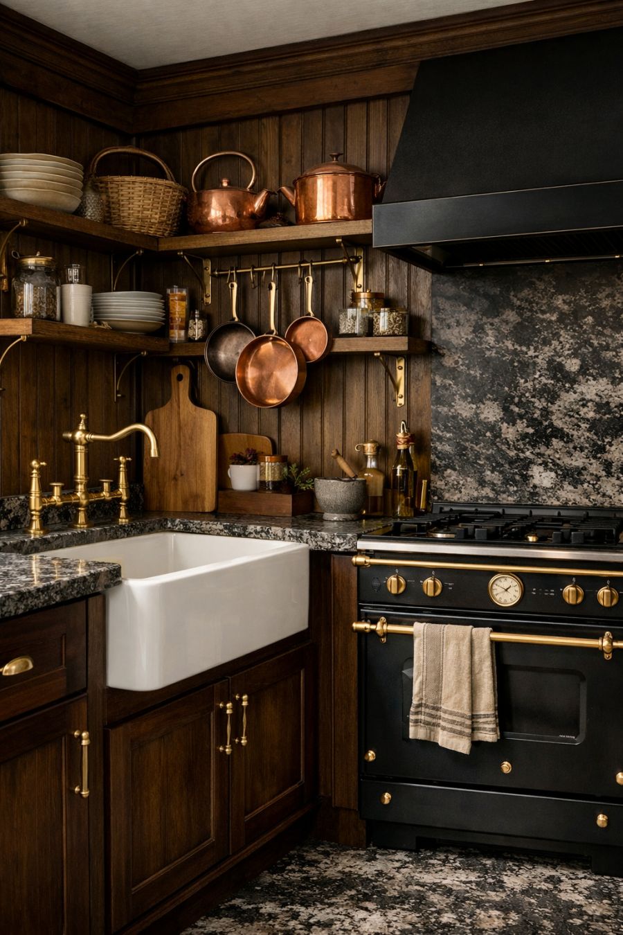 The kitchen is a seamless blend of functionality and style, featuring dark wood cabinetry and polished granite countertops. A large farmhouse sink and a vintage-style range cooker are nods to traditional kitchen design. Brass fixtures and fittings add a touch of elegance, while open shelving displays an array of copper pots and artisanal dishware. The overall aesthetic is both practical and sophisticated, catering to the culinary enthusiast.