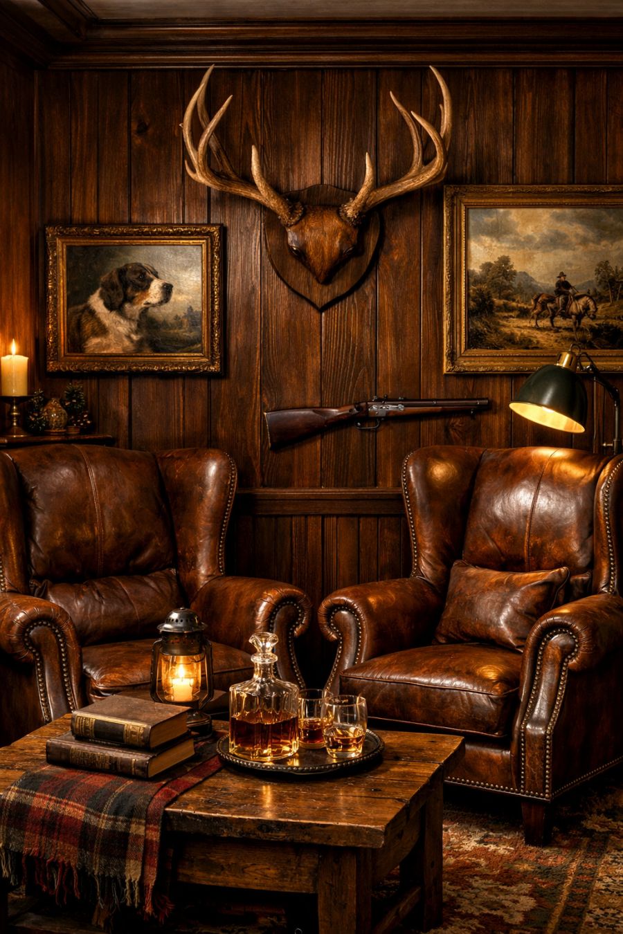 Stepping inside, the living area is a stark contrast to the light-hearted exterior. Rich, dark wood paneling lines the walls, creating an atmosphere of warmth and tradition. The space is anchored by a pair of leather wingback chairs, inviting relaxation and conversation. Classic hunting lodge motifs, such as mounted antlers and vintage oil paintings, enhance the space's old-world charm, offering a cozy retreat from the modern world.