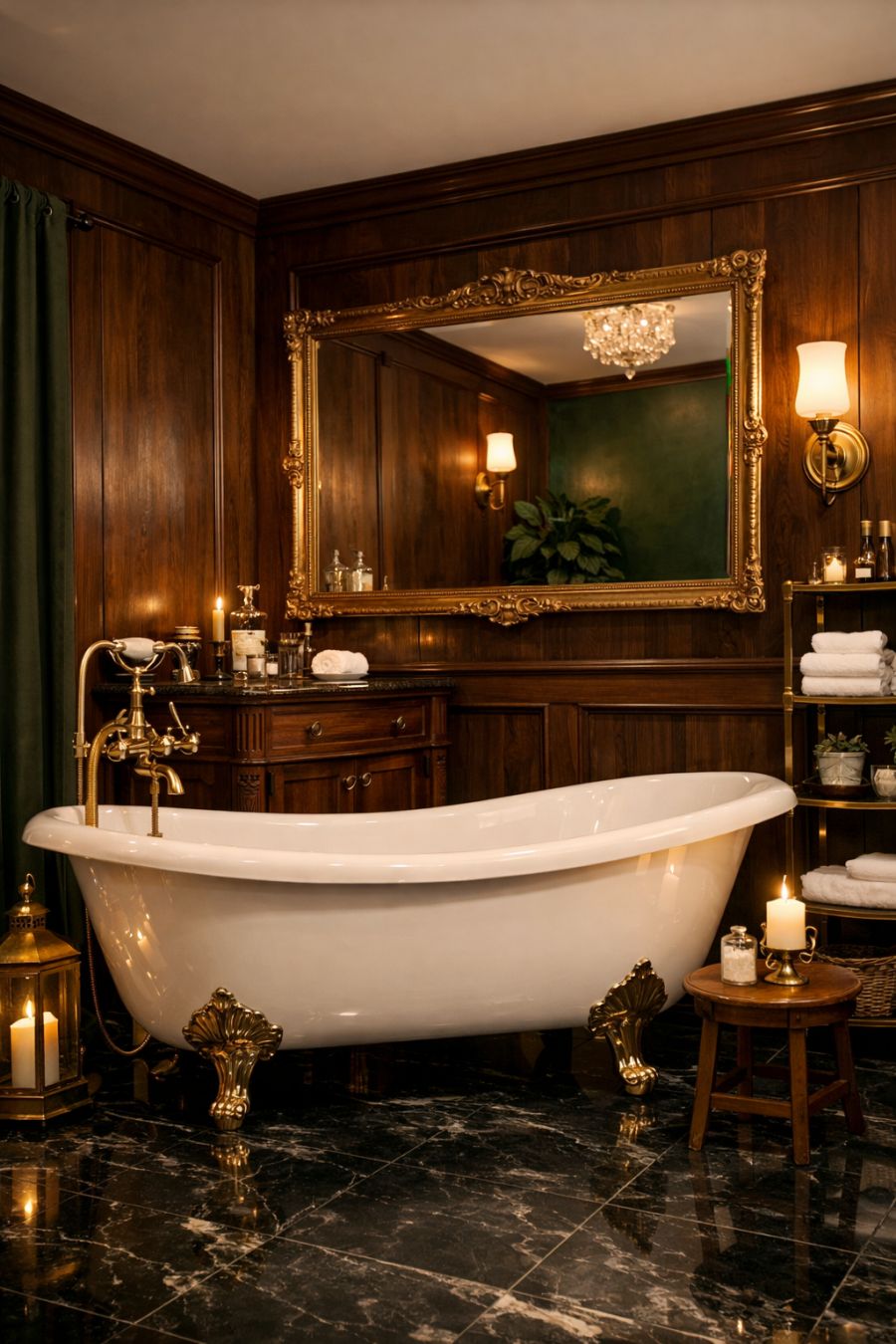 The bathroom is a study in luxury, with dark, marble-tiled floors and rich wood paneling. A freestanding clawfoot tub serves as the centerpiece, inviting relaxation and indulgence. Brass fixtures and a vintage-style vanity add a touch of elegance, while a large, framed mirror enhances the sense of space. The color scheme of deep greens and browns creates a calming, natural ambiance, transforming the bathroom into a private sanctuary.