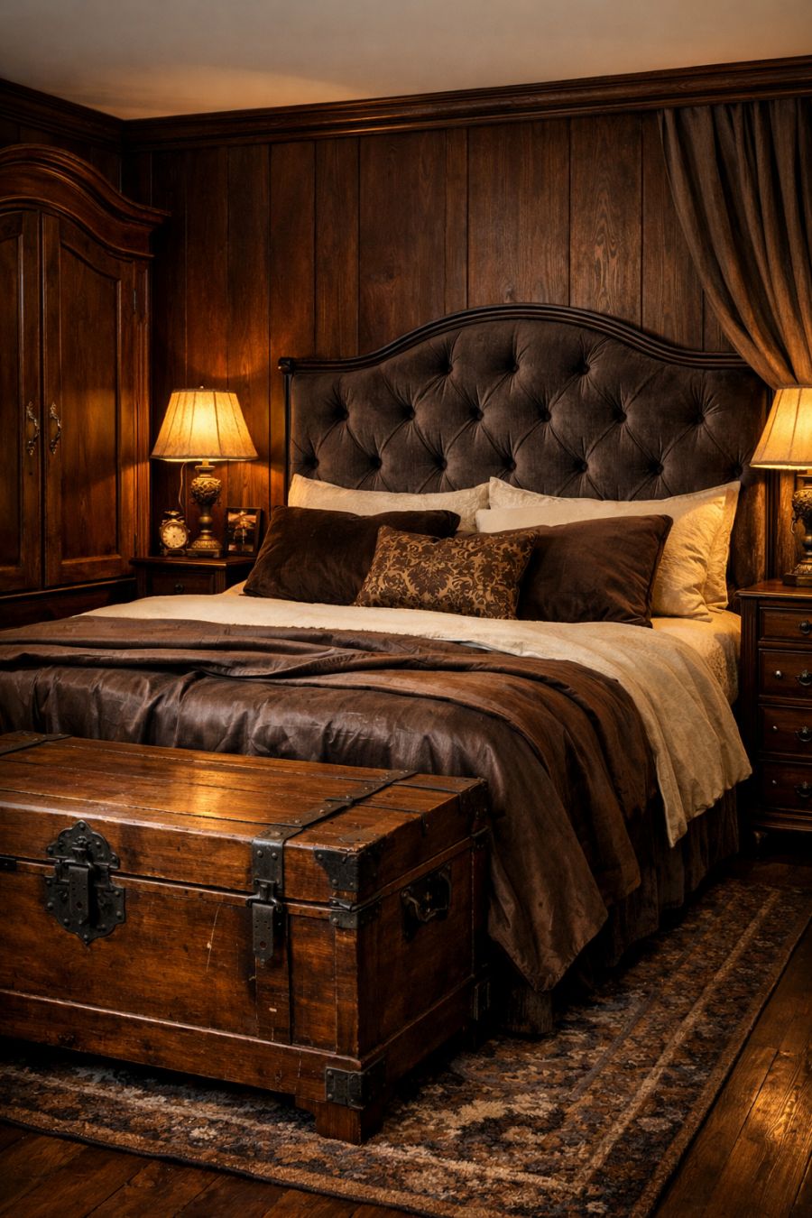 The bedroom offers a serene escape, with its deep, rich color palette and sumptuous materials. Dark wood paneling is softened by plush textiles, including a large, tufted headboard and heavy drapes. An antique wardrobe and a wooden chest at the foot of the bed provide ample storage and add to the room's vintage charm. Soft lighting and luxurious bedding ensure a restful night's sleep, enveloped in a cocoon of comfort and tradition.