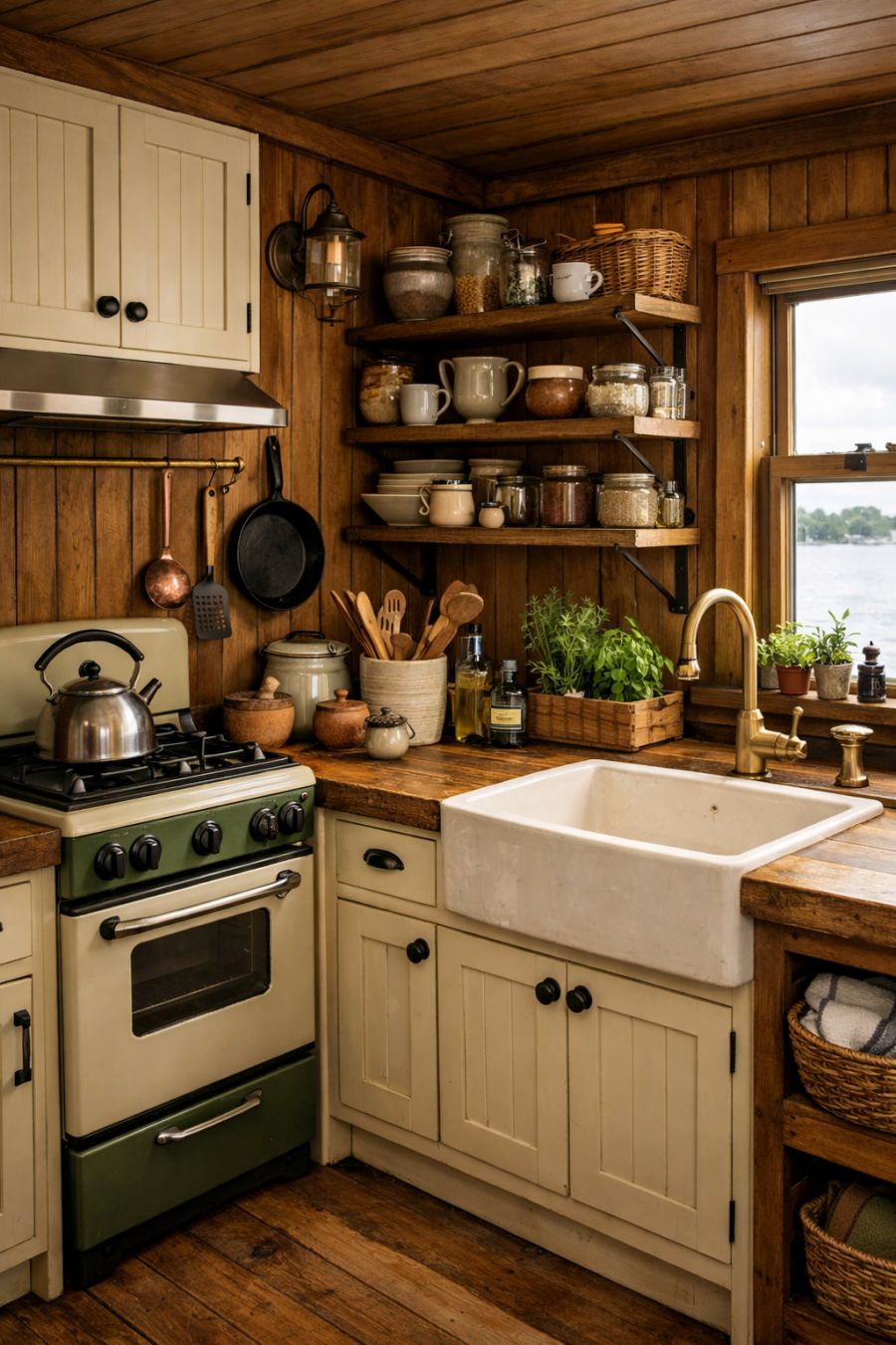 The kitchen is a blend of functionality and rustic aesthetics, offering a space where cooking becomes a delightful experience. Wooden cabinets, painted in a soft cream hue, provide ample storage while complementing the warm tones of the wood-paneled walls. A vintage-inspired stove and a farmhouse sink add character, harking back to simpler times. The countertops are crafted from reclaimed wood, offering a sturdy and sustainable surface for meal preparation. Thoughtful touches like open shelving displaying artisanal pottery and a small herb garden by the window infuse the space with a personal touch.
