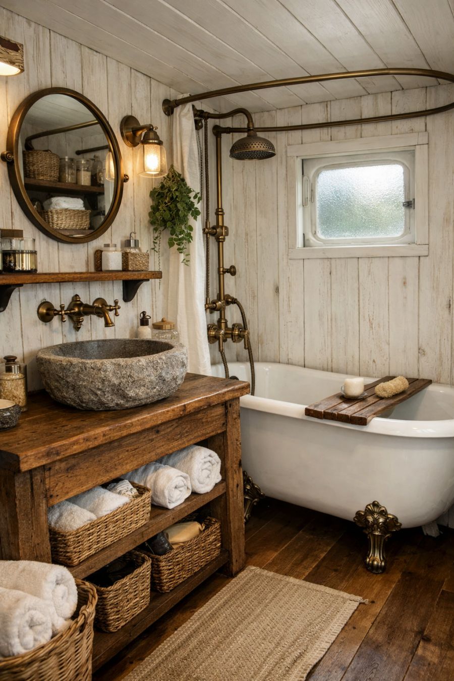 The bathroom combines practicality with a touch of rustic charm, creating a space that is both functional and inviting. The walls are clad in whitewashed wood, providing a bright and airy feel. A vintage-style clawfoot tub serves as a focal point, perfect for unwinding after a long day. The vanity, crafted from reclaimed wood, features a stone basin and antique brass fixtures, adding a touch of elegance. Natural light filters through a small, frosted window, creating a serene atmosphere while maintaining privacy. Thoughtful storage solutions ensure that essentials are neatly tucked away, enhancing the room's overall sense of tranquility.