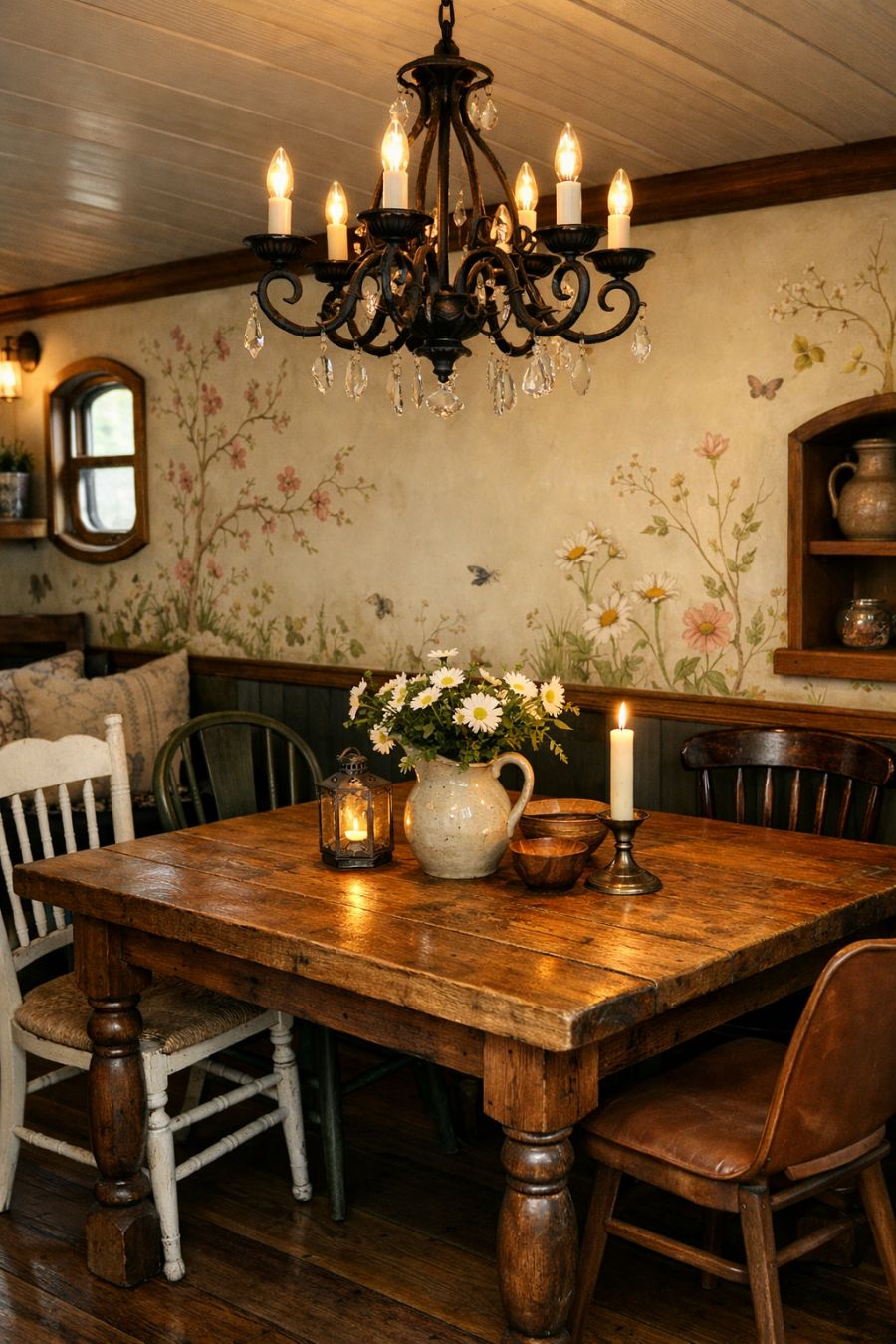 The dining area is a seamless extension of the living space, thoughtfully designed to accommodate intimate meals. A handcrafted wooden table, with its natural grain and sturdy build, anchors the room. Surrounding it are mismatched chairs, each with its own character, adding to the eclectic charm. The walls are adorned with delicate, hand-painted motifs of spring flora, bringing the outside in. Overhead, a wrought-iron chandelier casts a soft glow, enhancing the ambiance of cozy elegance. This space is perfect for enjoying a leisurely breakfast or a candlelit dinner.