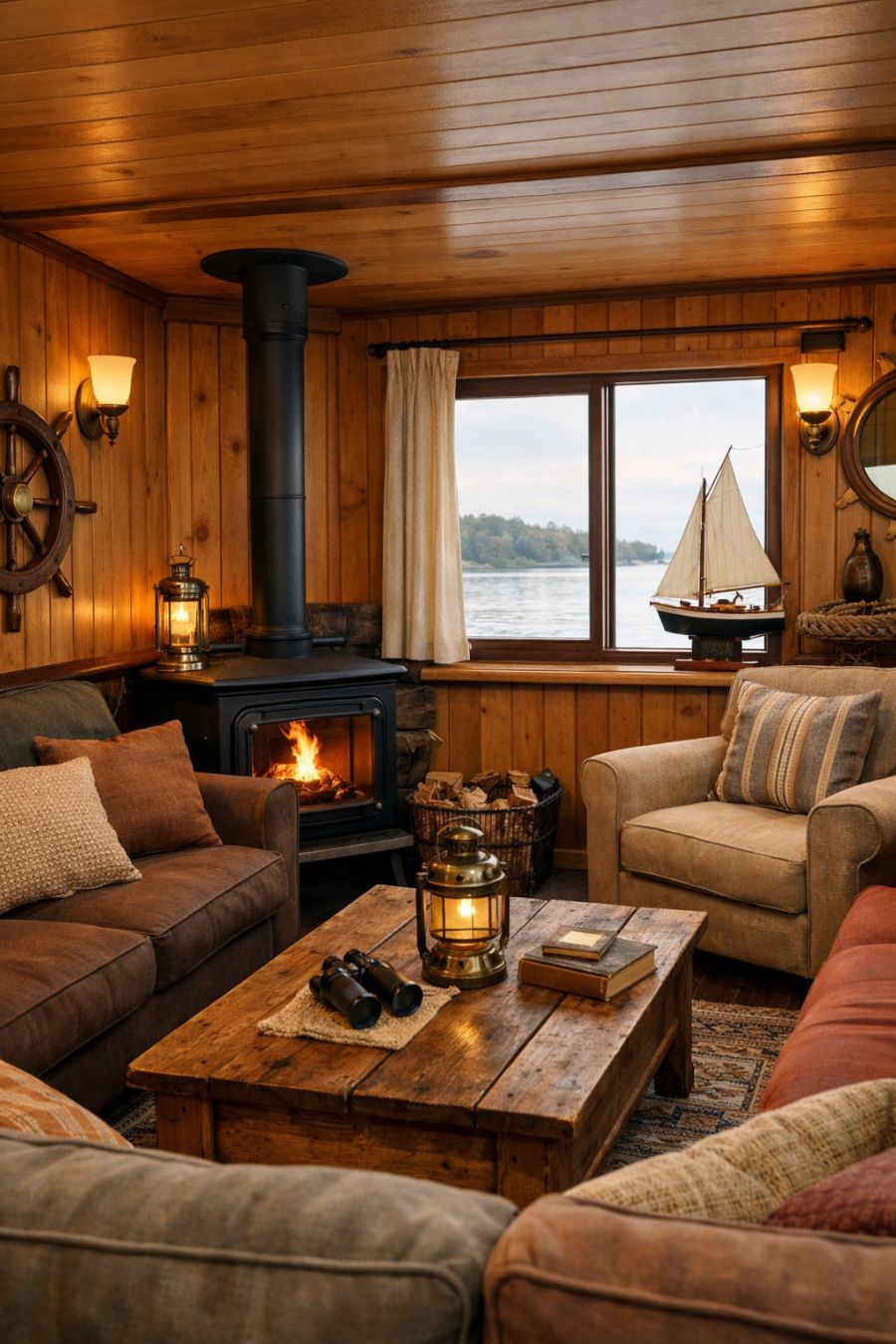 Upon entering the houseboat, you're greeted by a living area that combines comfort with rustic elegance. The walls are clad in warm, honey-toned wood panels that echo the exterior's board-and-batten style. Plush seating with earth-toned cushions provides a cozy spot to relax, while the large windows offer uninterrupted views of the water. A vintage wood-burning stove serves as both a focal point and a source of warmth, perfect for those crisp April evenings. Tasteful nautical accents and soft, ambient lighting complete the space, creating an inviting atmosphere.