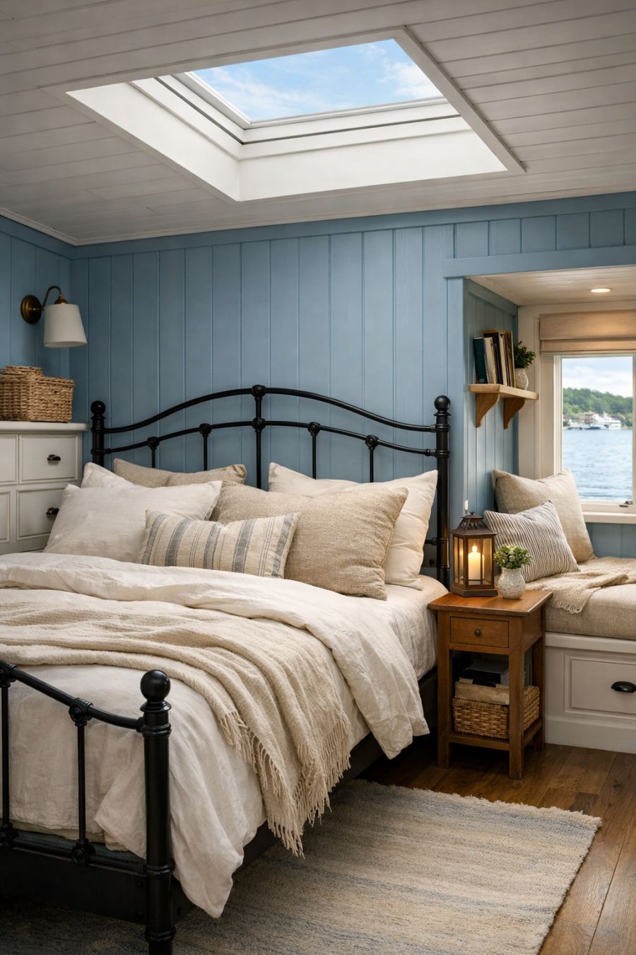 The bedroom offers a serene retreat, designed with relaxation in mind. The walls, like the rest of the houseboat, feature the signature board-and-batten style, painted in a calming soft blue. A large, comfortable bed with a wrought-iron frame is the centerpiece, adorned with layers of plush bedding in neutral tones. Natural light streams in through a skylight, illuminating the space and highlighting the simple yet elegant decor. Built-in storage solutions ensure a clutter-free environment, while a small reading nook provides a quiet corner for reflection.