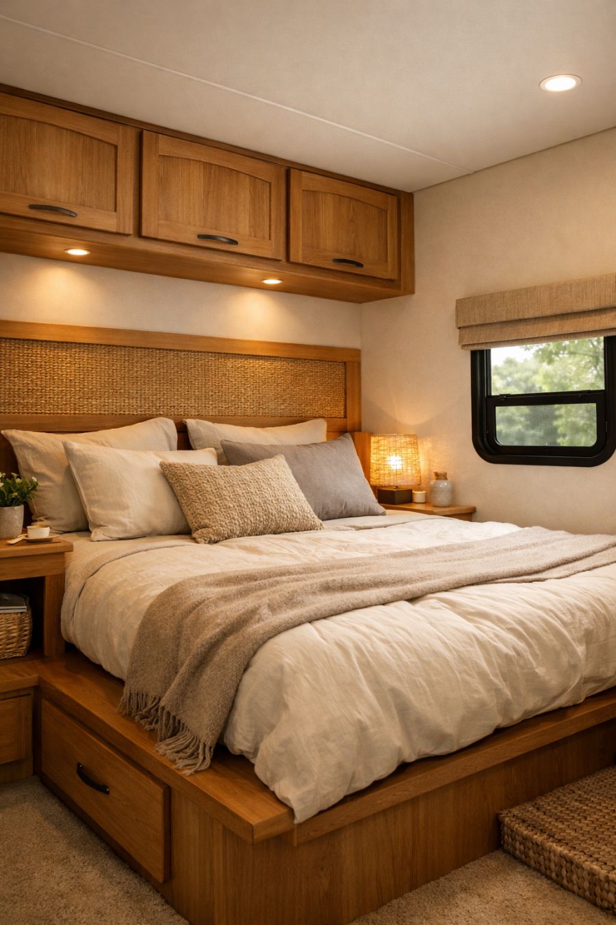 The bedroom area is a sanctuary of calm, designed to maximize comfort and relaxation. A low platform bed with a plush mattress serves as the centerpiece, adorned with soft, neutral linens. The walls are painted in a soothing shade of off-white, creating a tranquil backdrop that enhances the natural wood accents. Built-in storage solutions ensure that the space remains clutter-free, while ambient lighting adds warmth and coziness to the room. A small window allows natural light to filter in, creating a serene and restful atmosphere.