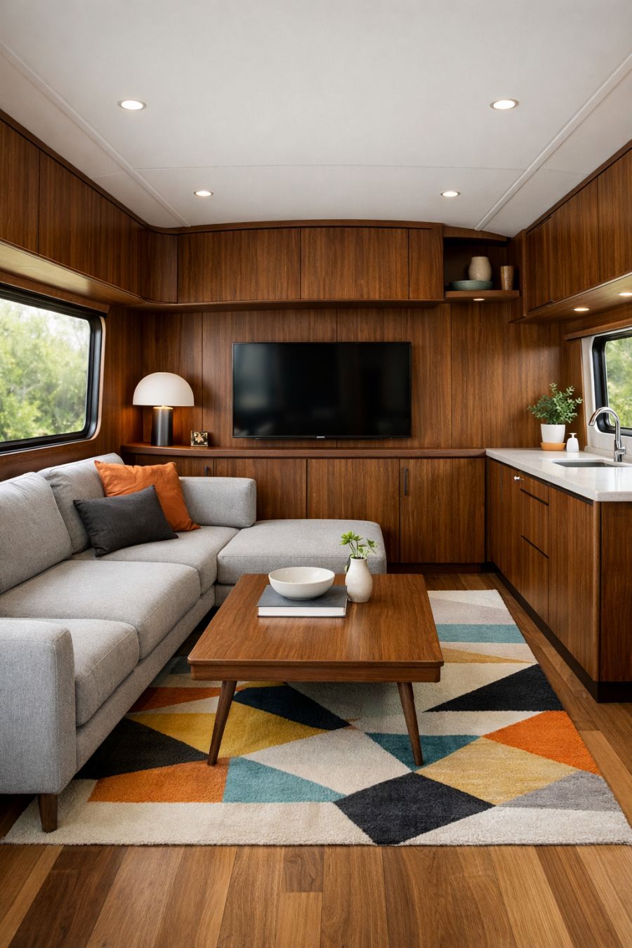 This RV camper represents an ideal living solution for those who crave a balance between mobility and style. It offers the freedom to explore without sacrificing the comforts and aesthetics of a traditional home. The unique combination of rustic exterior charm and sleek, Mid-Century Modern interiors makes it an attractive option for design-conscious individuals seeking a distinct living experience. Whether parked amid blossoming nature or set against an urban backdrop, this camper provides a versatile and elegant retreat for modern nomads.