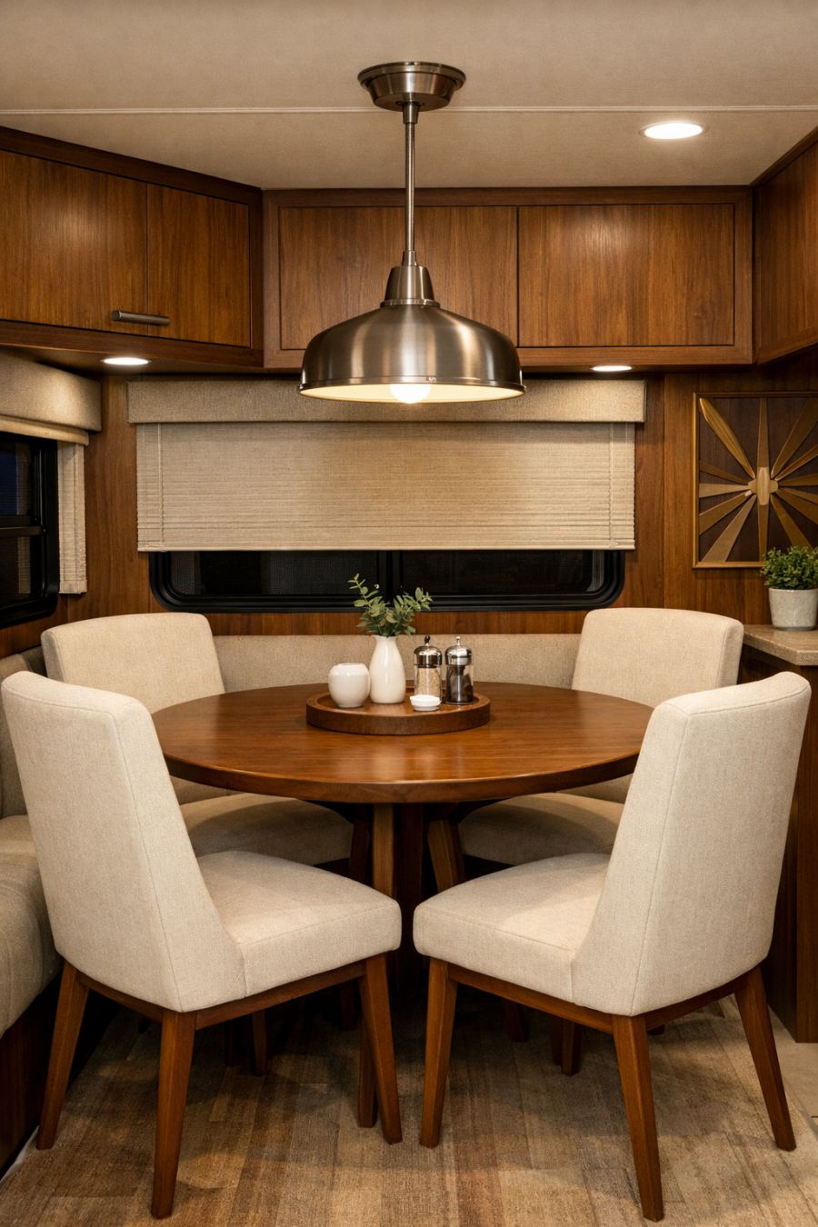 The dining area continues the Mid-Century Modern theme with a compact yet stylish setup. A round, walnut dining table is paired with high-backed chairs upholstered in a soft, cream fabric, creating an inviting space for meals. A pendant light with a brushed metal finish hangs overhead, providing both illumination and a touch of industrial chic. The use of warm wood tones and understated elegance ensures that the dining space feels both intimate and functional, perfect for hosting small gatherings or enjoying a quiet dinner.