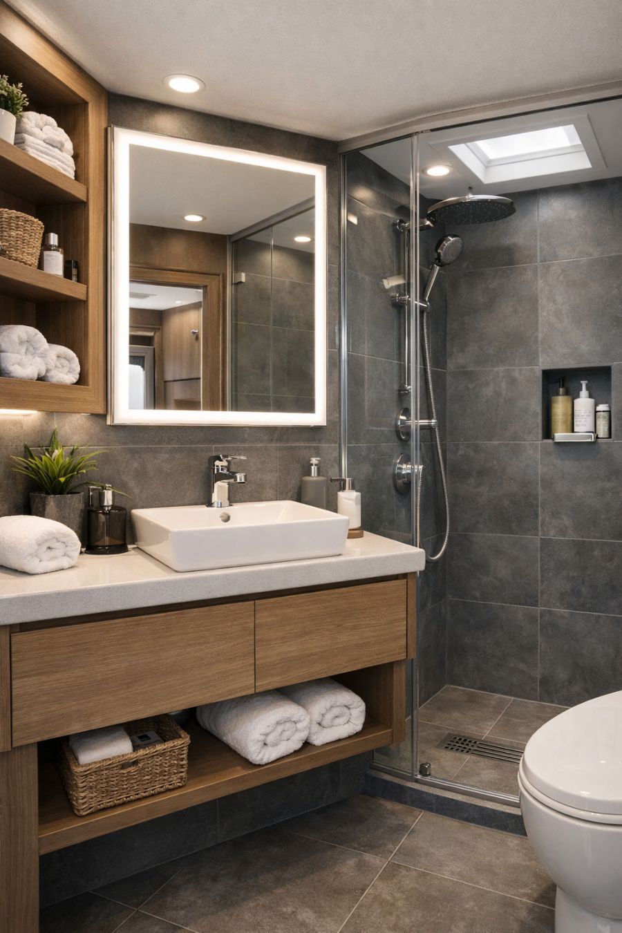 The bathroom is a study in contemporary elegance, with a focus on functionality and style. The space features a walk-in shower with a frameless glass enclosure, giving it a modern and open feel. The walls are clad in large, slate-colored tiles that add a touch of luxury, complemented by a floating vanity with a sleek, white basin. Chrome fixtures provide a touch of modernity, while a backlit mirror enhances the sense of space. Thoughtful storage solutions and natural light contribute to a bathroom that is both practical and aesthetically pleasing.
