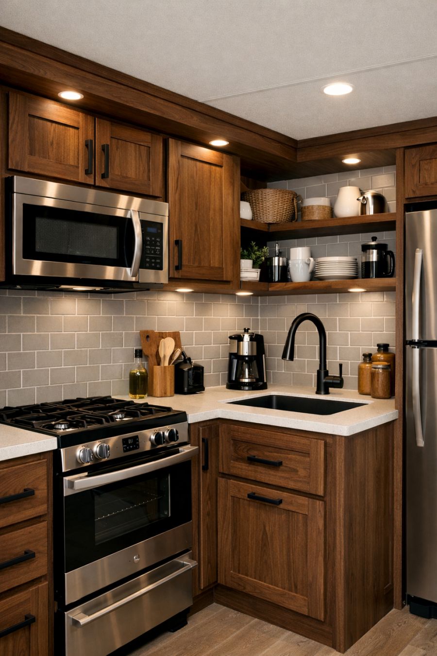 In the kitchen, functionality meets style in a seamless blend. The cabinetry is crafted from walnut, echoing the living area's aesthetic, and is complemented by sleek, matte black hardware. Modern appliances are integrated into the design, offering all the conveniences of a full-sized kitchen within a compact space. A subway tile backsplash in a soft grey adds a subtle contrast, while open shelving provides both storage and a display area for curated kitchenware. The overall effect is one of streamlined efficiency and modern sophistication.