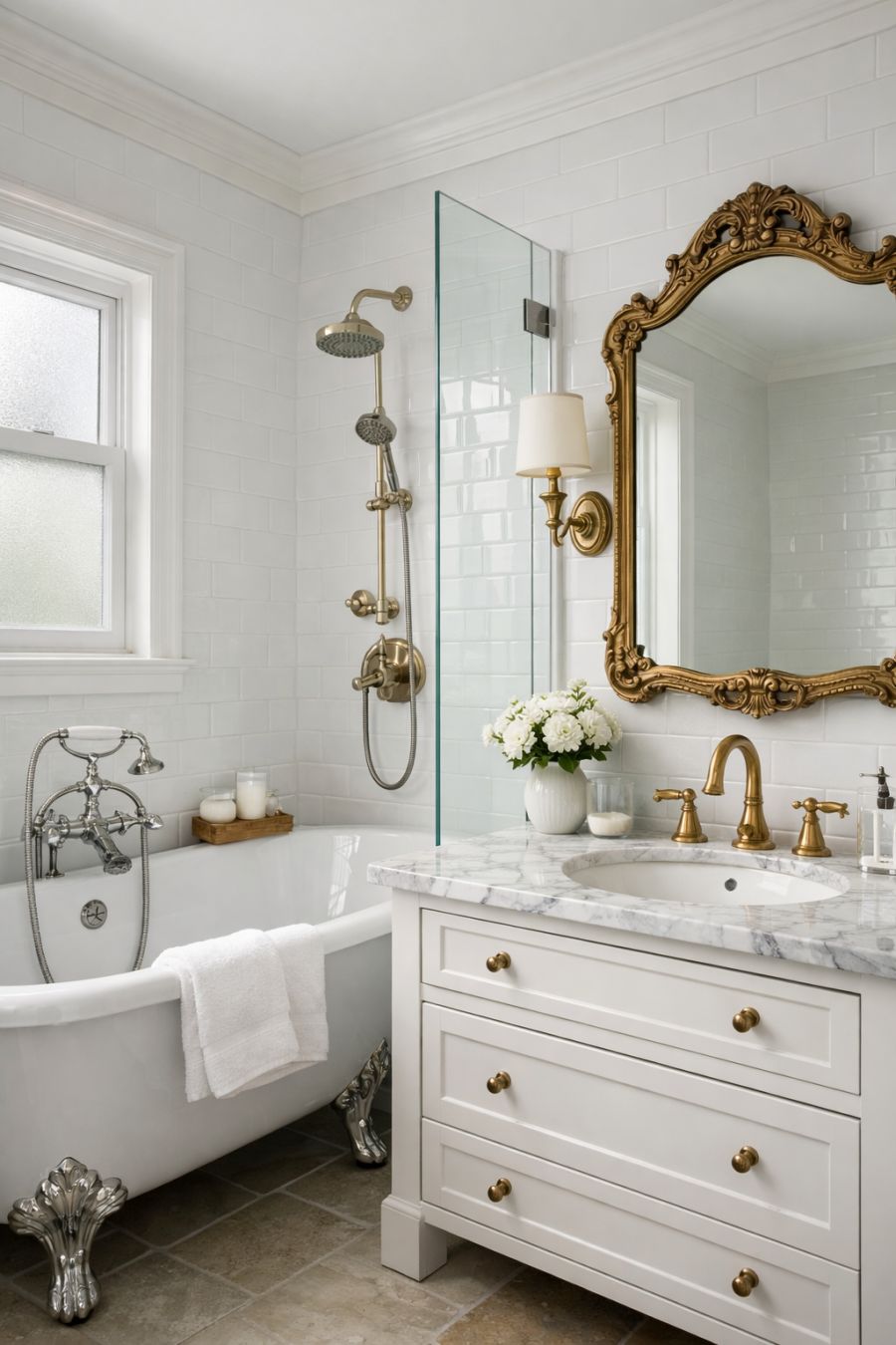 The bathroom exudes an understated elegance, where classic design elements meet contemporary amenities. Gleaming white tiles cover the walls, reflecting the natural light that streams in through a frosted window. A clawfoot tub invites leisurely soaks, while a separate glass-enclosed shower offers modern convenience. The vanity, with its marble countertop and brass fixtures, adds a touch of luxury, complemented by an ornate mirror that adds depth and style to the space. The overall ambiance is one of clean lines and timeless sophistication, ensuring a refreshing and relaxing experience.