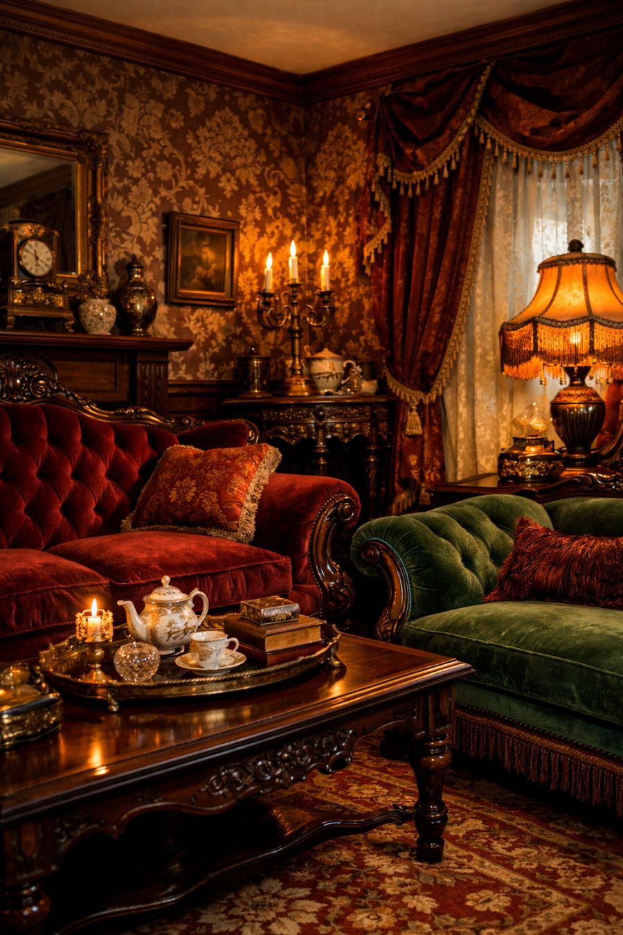 Crossing the threshold into the living area is like stepping back in time to a sumptuous Victorian parlor. Velvet settees in deep, rich hues invite you to sink into their plush embrace. Fringed lampshades cast a warm, diffused glow throughout the room, highlighting ornate wallpaper with intricate patterns. The air is filled with the scent of polished wood and the soft rustle of heavy drapes, creating a cocoon of comfort and elegance. Every element is carefully curated to evoke a sense of opulence and refinement.