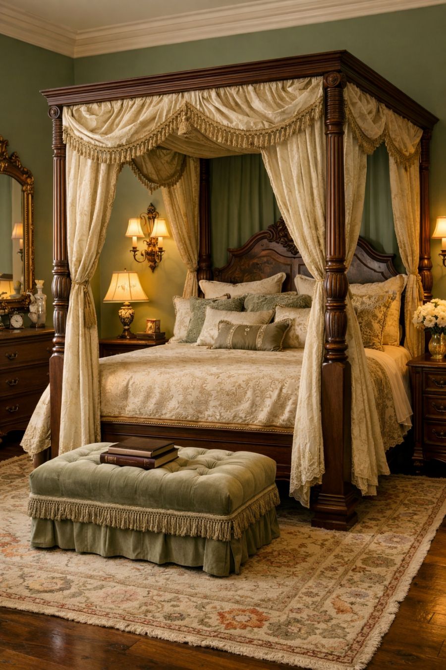 The bedroom is a sanctuary of tranquility, where Victorian elegance meets modern comfort. A grand four-poster bed draped in sumptuous fabrics takes center stage, offering a restful retreat. The walls are painted in a soothing sage green, creating a calming backdrop for antique furnishings and decorative accents. Soft lighting from vintage sconces casts a gentle glow, enhancing the room's serene atmosphere. Plush rugs underfoot add warmth and texture, making the bedroom a perfect haven for relaxation and rest.