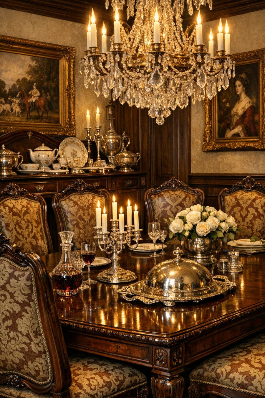 The dining area continues the theme of Victorian luxury with an impressive mahogany table as its centerpiece. Surrounding it are high-backed chairs upholstered in rich brocade, perfect for hosting lavish dinner parties. An antique sideboard displays fine china and silverware, reflecting the flickering candlelight from a crystal chandelier overhead. The walls are adorned with period artwork, adding to the room's historical ambiance. It's a space designed for grand gatherings, where every meal becomes a special occasion.