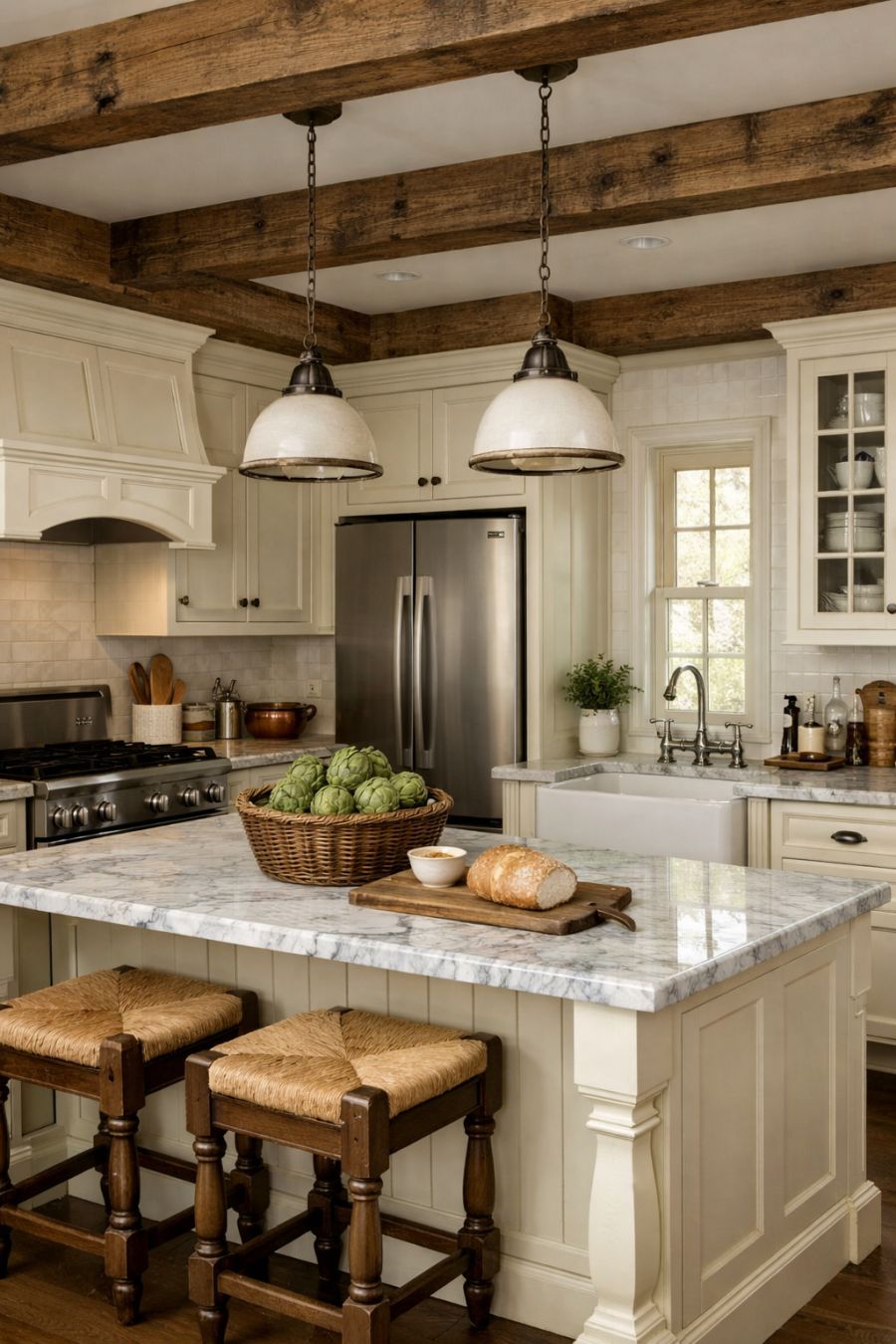 The kitchen blends modern functionality with vintage charm, featuring state-of-the-art appliances seamlessly integrated into a classic design. Elegant cabinetry painted in a soft cream hue provides ample storage, while a large farmhouse sink offers both practicality and style. The countertops, made of polished marble, add a touch of luxury and contrast beautifully with the rustic wooden beams overhead. A central island doubles as a workspace and casual dining area, making the kitchen both a functional and inviting hub of the home.