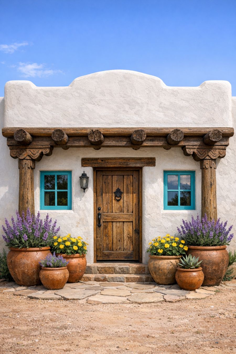 The exterior of this Santa Fe cottage is a testament to the timeless charm of Southwestern architecture. Its smooth, white-washed adobe walls are punctuated by rounded parapet edges, giving it a soft, inviting silhouette. Turquoise painted window frames add a pop of color and echo the vibrant skies of the desert. Carved wooden corbels support rustic vigas that extend from the roofline, offering a hint of traditional craftsmanship. Clay pots filled with purple sage and yellow desert marigolds line the front, infusing the scene with a touch of natural beauty and color.