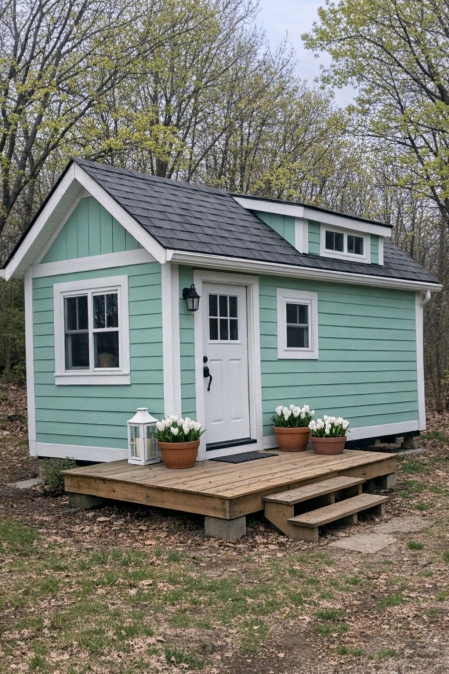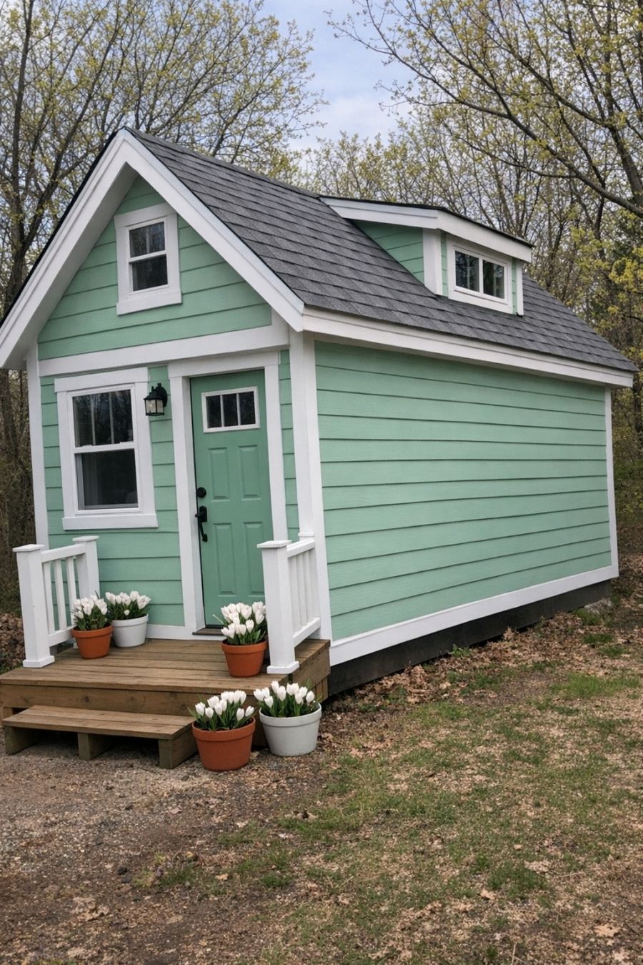 The exterior of this tiny home is a delightful sight to behold. Painted in a soothing mint green, the cottage exudes a sense of calm and tranquility, perfectly complemented by the grey shingle roof that adds a touch of classic elegance. The crisp white trim outlines the structure, highlighting its clean lines and accentuating its quaint charm. A small deck at the entrance, adorned with potted white crocus, offers a welcoming touch and a hint of natural beauty. Surrounded by budding trees, the home harmonizes with its natural surroundings, creating an inviting and picturesque scene.