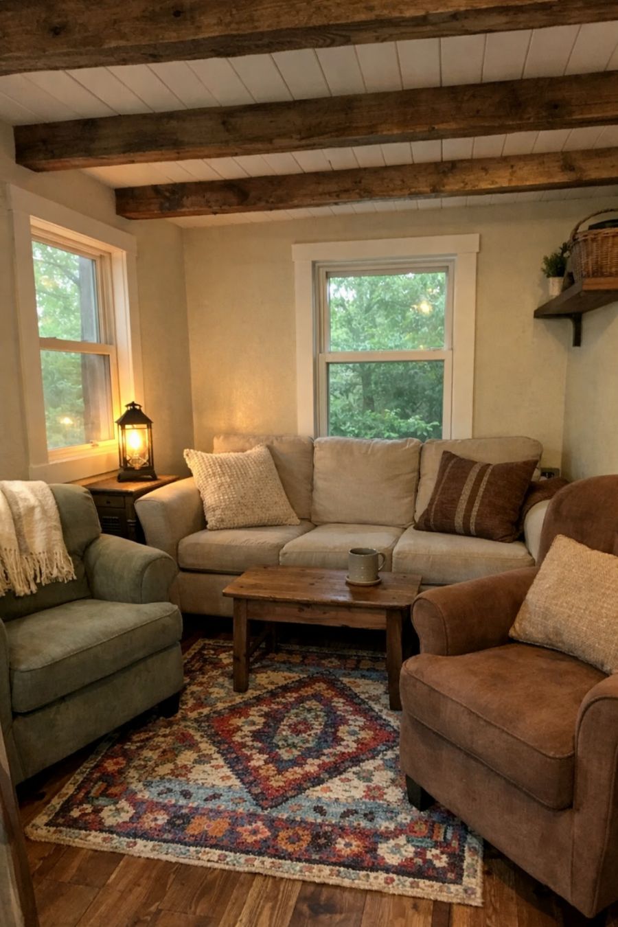 Step inside the living area, and you're greeted by a space that embodies warmth and comfort. The walls are painted a soft, neutral tone that enhances the natural light streaming through the large windows, creating an airy and open feel. Rustic wooden beams cross the ceiling, adding a touch of rustic charm that pays homage to the home's Amish-inspired roots. The furniture is carefully selected for both comfort and style, featuring a cozy sofa and a couple of armchairs upholstered in earthy tones. A small, intricately woven rug adds a splash of color and texture, tying the room together beautifully.
