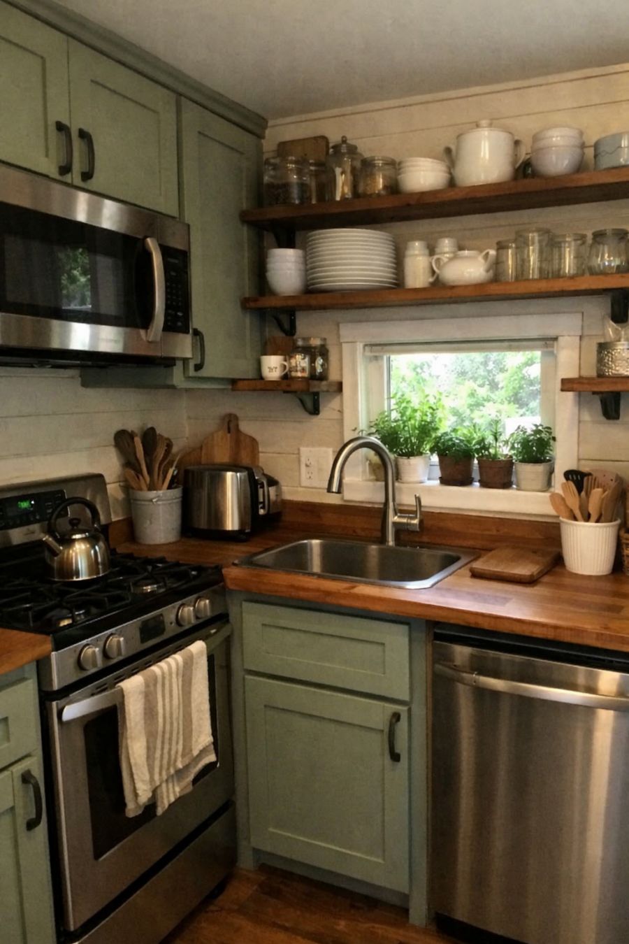 In the kitchen, you'll find a seamless blend of modern conveniences and classic charm. The cabinetry, painted in a muted sage green, provides ample storage while maintaining a clean and uncluttered look. Sleek, stainless steel appliances offer all the functionality needed for modern cooking, while the wooden countertops add warmth and a touch of rustic elegance. Open shelving displays an array of neatly arranged crockery and glassware, adding to the kitchen's character. A small herb garden sits on the windowsill, bringing a fresh and vibrant touch to the space.